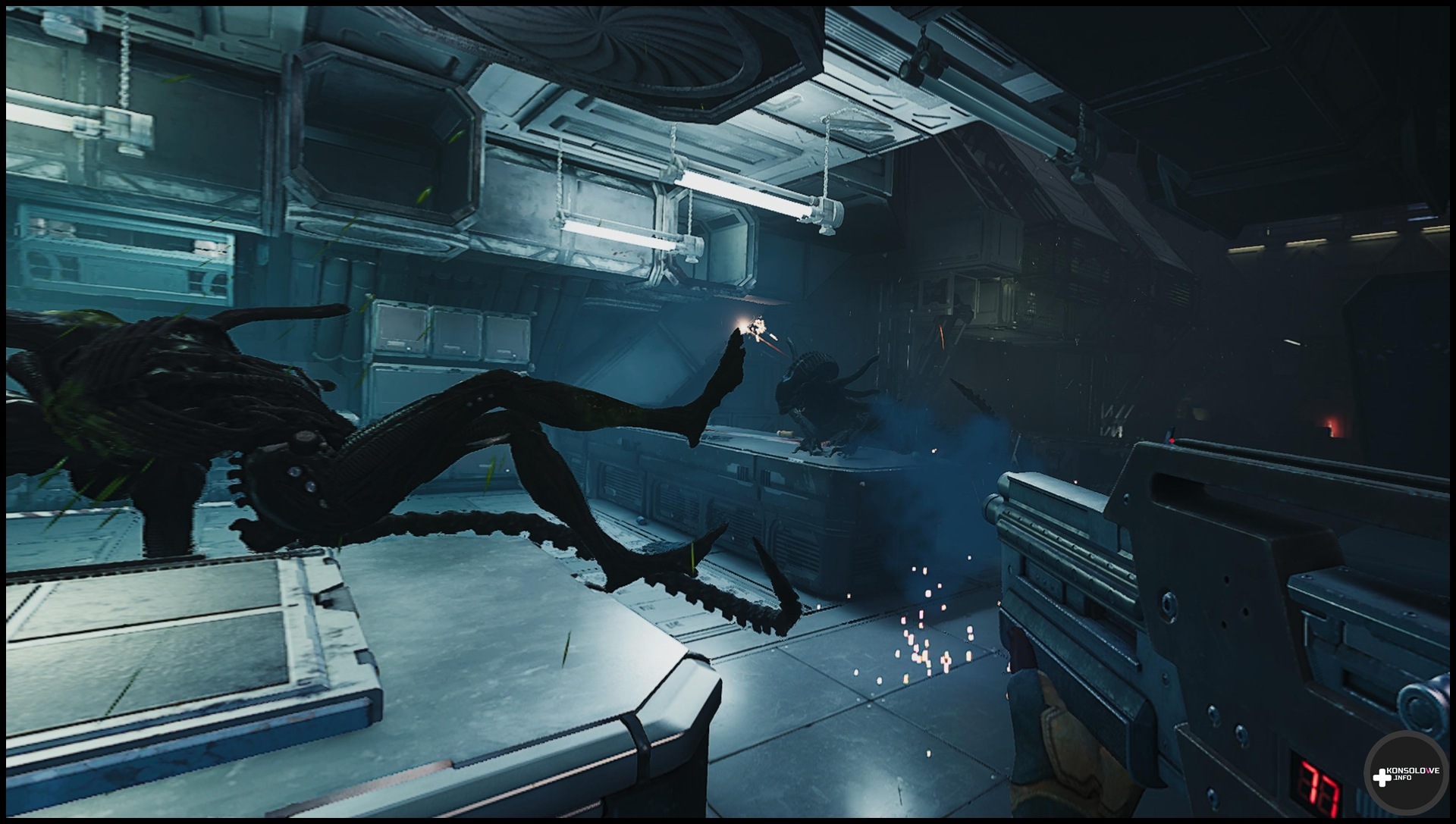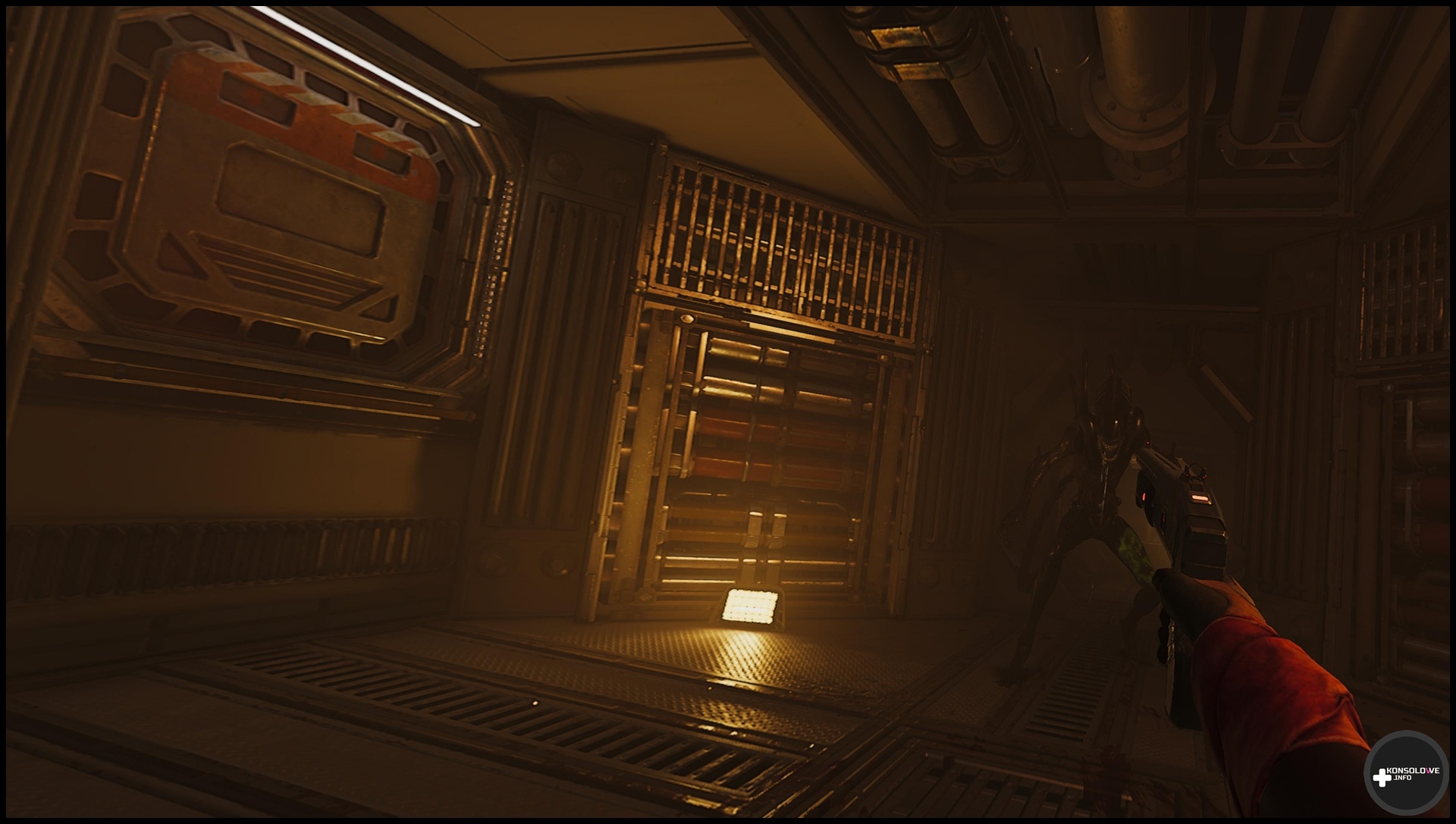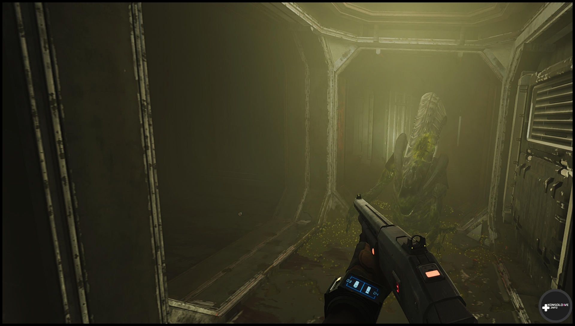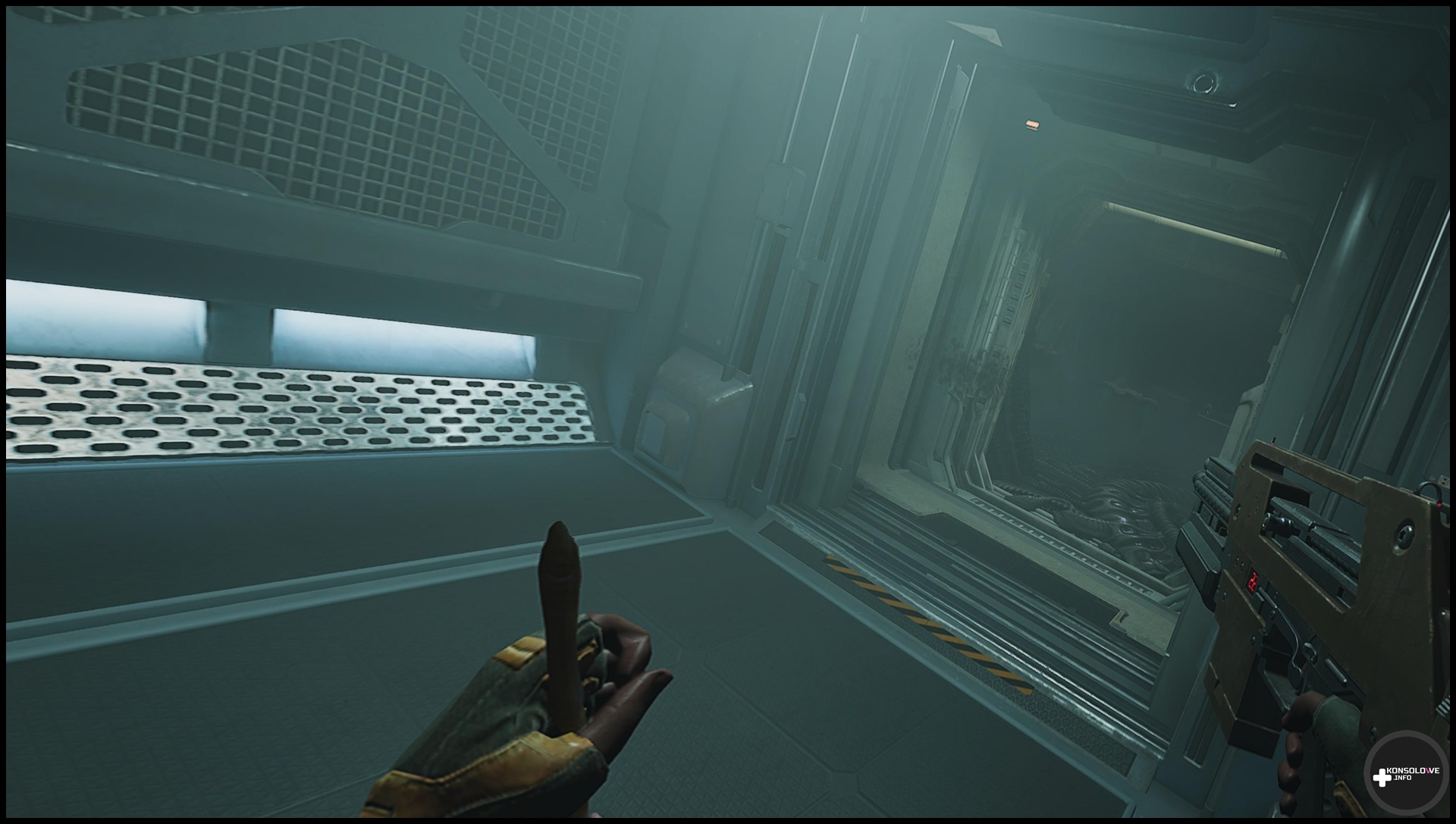 Często będziemy przemierzać korytarze oraz szyby wentylacyjne – choć bynajmniej nie doradzam przyzwyczajać się do nich. Jak z pewnością wiedzą fani filmowej serii, to właśnie szyby stanowią ulubione miejsca stacjonowania ksenomorfów. Nierzadko będziemy też musieli przepiąć kable, by otworzyć sobie przejście. Wiąże się to z dość prostą minigierką, która nie frustruje, ale wprowadza pewne urozmaicenie do rozgrywki. Nie mogę również nie wspomnieć o zapisywaniu rozgrywki w specjalnych kryjówkach, co odbywa się po włożeniu tabletu do odpowiedniego gniazda. Warto tam też przeszukiwać szafki – możemy w nich znaleźć stymulanty lecznicze, czy zapas amunicji. Oczywiście jak często byśmy nie sprawdzali odczytów na wykrywaczu ruchu i nasłuchiwali, w końcu natkniemy się na ksenomorfy. W starciu z nimi bynajmniej nie jesteśmy bezbronni. Możemy korzystać z karabinu pulsacyjnego, strzelby oraz rewolweru, a nawet granatów (o ile znajdziemy je w świecie gry).