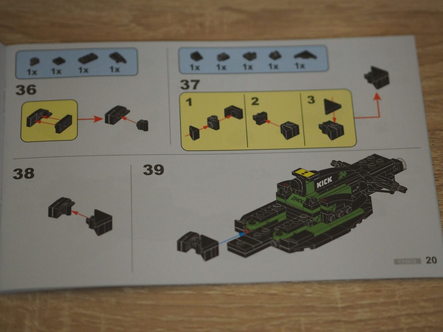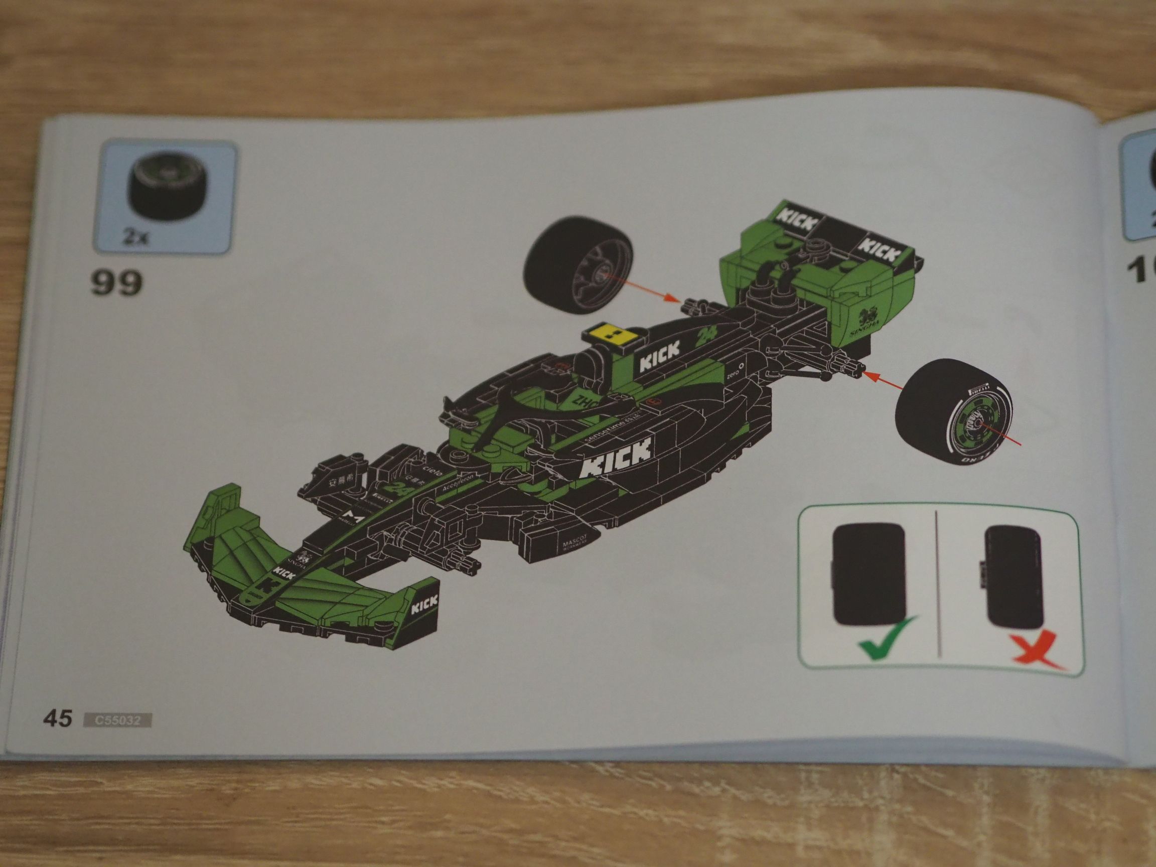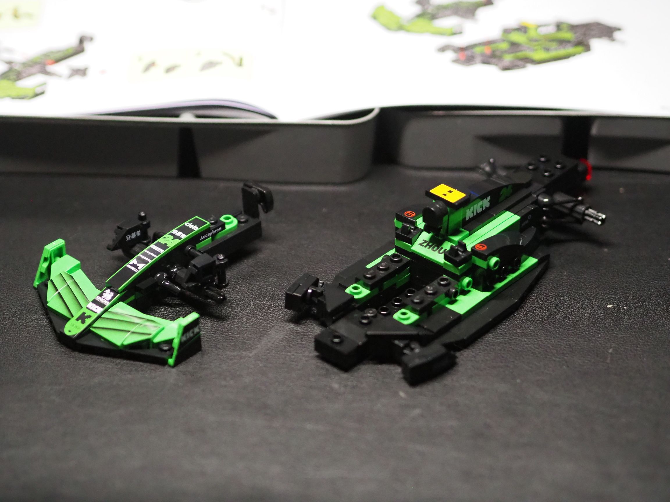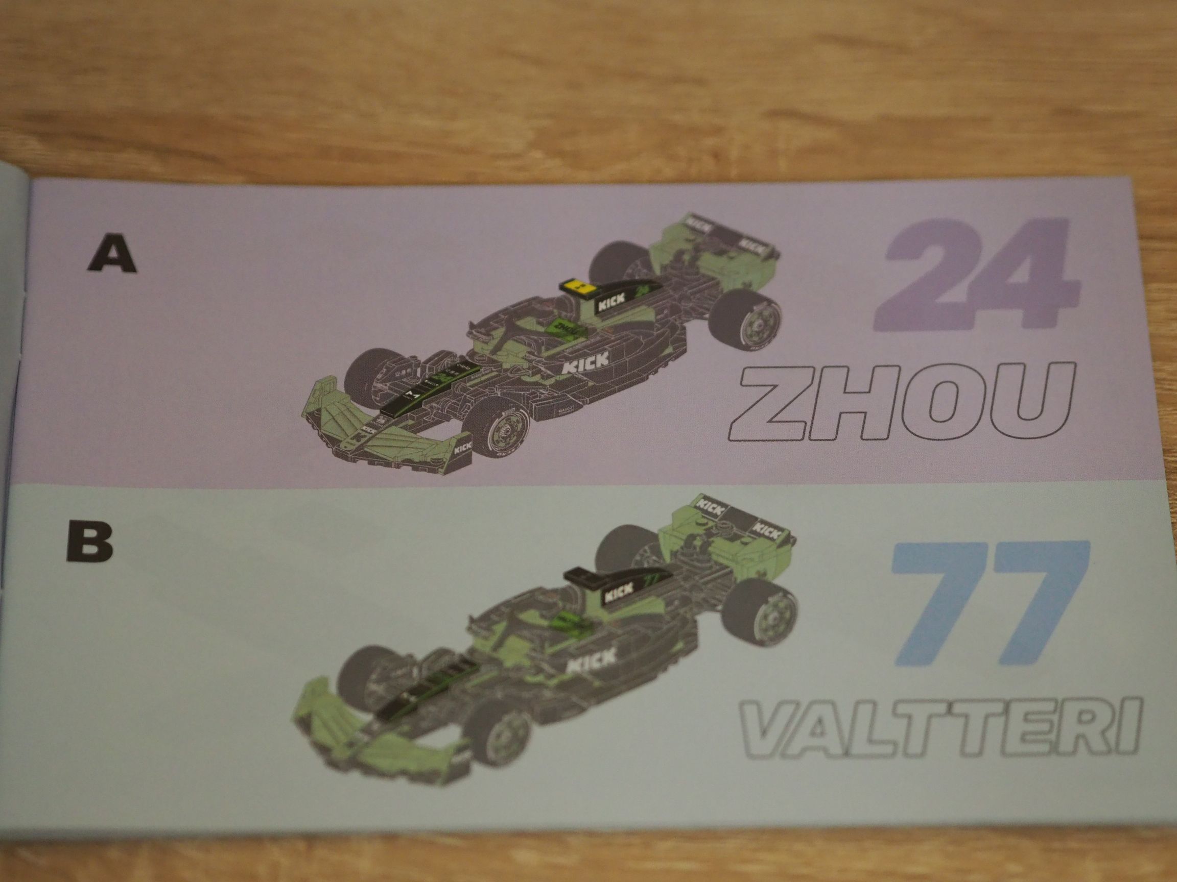 Wspomniałem na początku, że budując bolid CaDA KICK Sauber F1 Team możemy zdecydować, dla którego kierowcy będzie on przeznaczony. Fioletowe strony instrukcji przeznaczone są dla Zhou Guanyu, a niebieskie dla Valtteriego Bottasa. To naprawdę niesamowite, że w zestawie za sto złotych otrzymujemy aż osiem nadrukowanych personalizowanych klocków, które pozwolą, aby nasz bolid identyfikował się z konkretnym kierowcą. Te klocki, to nos, fotel (z imieniem), obudowa silnika oraz żółte lub czarne skrzydełka przy wlocie powietrza do silnika. Obudowa silnika oraz nos zawierają numery kierowców – 24 dla Zhou i 77 dla Bottasa.