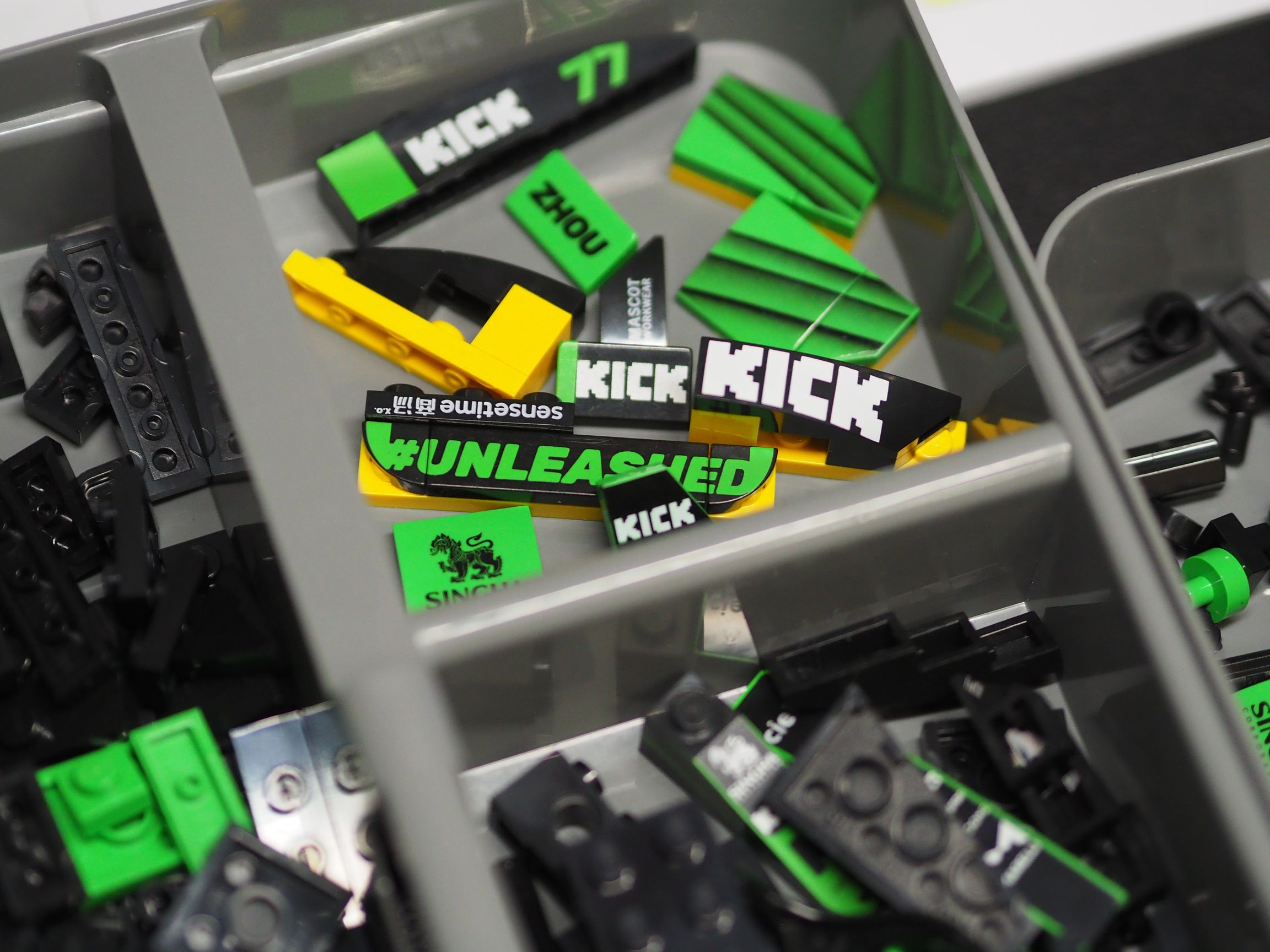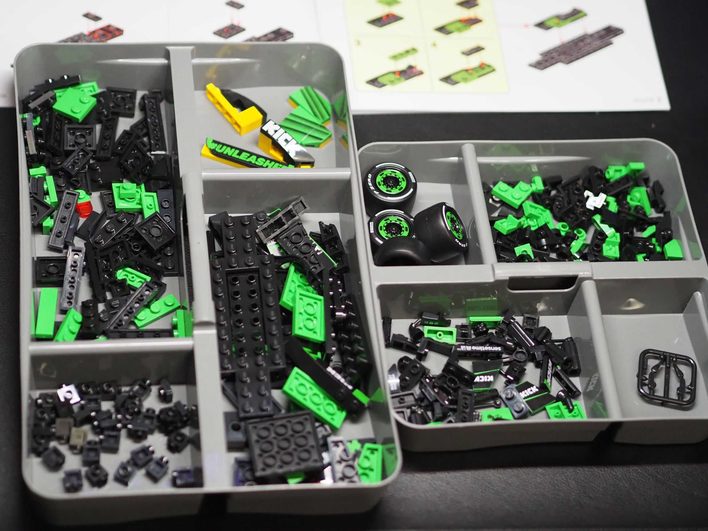 Budowanie bolidu CaDA KICK Sauber F1 Team zaczynamy od podłogi. Mamy tu jeden duży element w formie plusa, na którego nanosimy czarne i zielone płytki. Szybko powstaje miejsce dla kierowcy oraz obudowa silnika. Następnie ładnie zaokrąglony nos z przednim skrzydłem oraz na koniec już tylko tylne skrzydło. Czas budowy powinien wynieść jakiś 30-40 minut. Kolorystyka jest kapitalna ani przez chwilę nie wkrada się monotonia w budowaniu. Jak już wspomniałem, budowanie jest bardzo łatwe, jednak zestaw zawiera wiele małych elementów, choćby jak części służące za imitacje zawieszenia, albo lusterka. Sporo mamy tutaj malutkich klocków 1×1, warto więc zadbać o bezpieczeństwo, aby najmłodsi domownicy, ale zwierzęta ich nie połknęli. W zestawie znajdziemy bardzo ładny nadruk kierownicy z wyświetlaczem oraz wieloma przyciskami i pokrętłami. Spoiler przedni oraz tylni mają nadruki, to naprawdę fantastyczne, że w tym zestawie nie musimy się męczyć z żadnymi naklejkami.