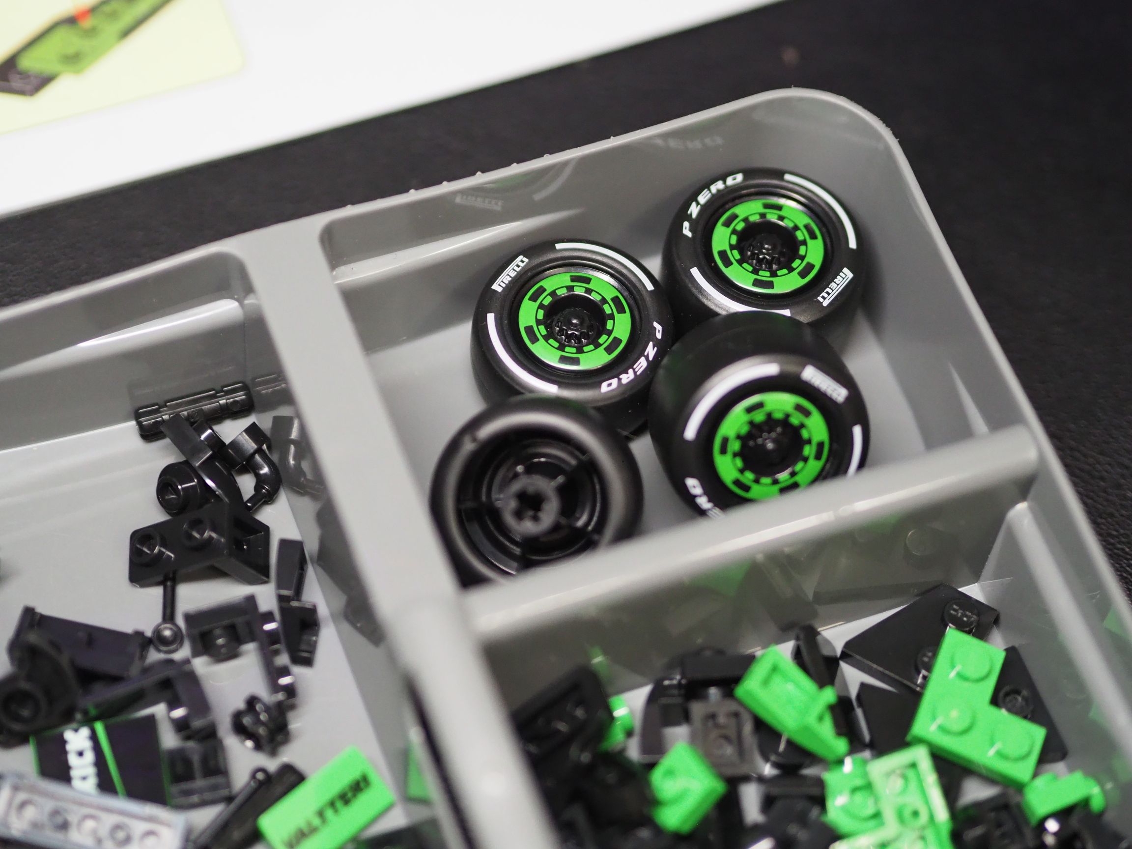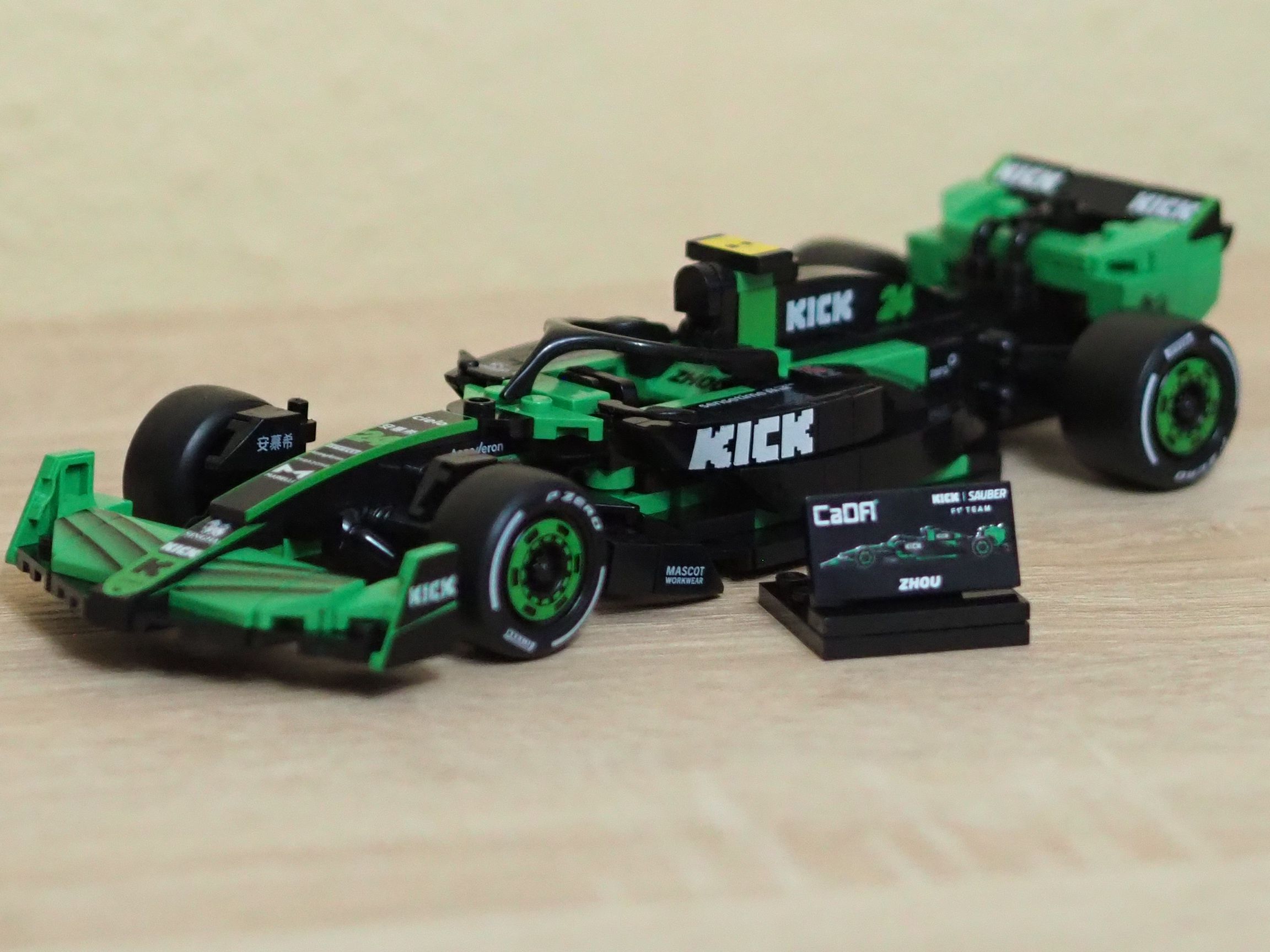 Z pewnością dużym zaskoczeniem będzie dla was w końcu normalna konstrukcja osłony głowy kierowcy. HALO nie jest rurką z plastiku, czy gumy. CaDa jest pierwszy producentem, który przygotował w pełni odlany system Halo w kształcie procy. Niestety w zestawach LEGO Speed Champions na 2025 rok będzie to nadal wyginana plastikowa rurka. W modelu CaDA KICK Sauber F1 Team wszystko jest na tyle idealne, że nawet zadbano o najważniejsze szczegóły przy produkcji opon. Mamy tutaj piękne slicki z białym paskiem oraz logo Pirelli. Do tego, co bardzo ważne opony na tył są szersze, jak w prawdziwym bolidzie F1. Tradycją już jest, że nawet do najmniejszych licencjonowanych zestawów firma CaDA dodaje tabliczkę z nadrukiem. A w tym zestawie mamy je aż dwie, jedną dla Bottasa i jedną oczywiście dla Zhou.