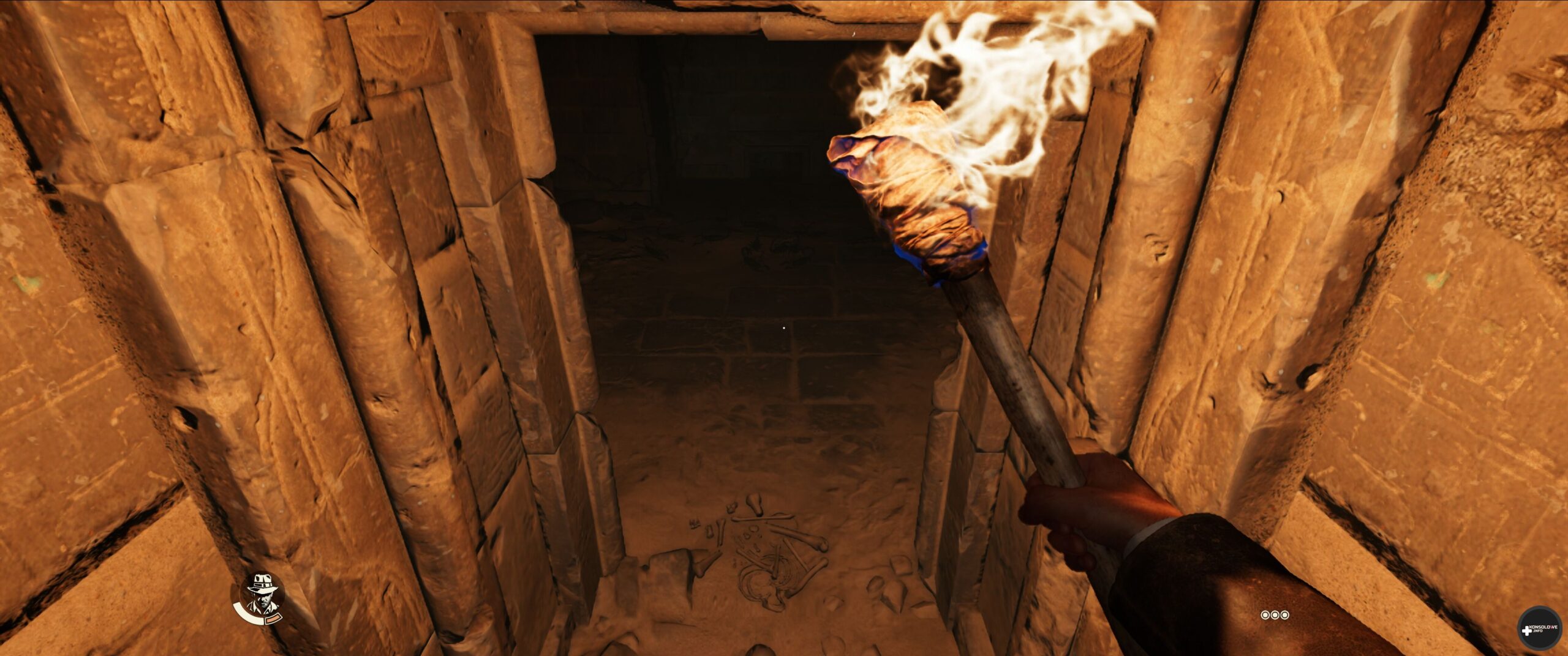 Studio MachineGames zrealizowało samouczek w fenomenalny sposób. Już tłumaczę, co mam na myśli. Jako etap szkoleniowy służy otwarcie filmu Indiana Jones i Poszukiwacze Zaginionej Arki. Zdecydowano się na absolutnie perfekcyjne przeniesienie znanej fanom sceny do gry. Nie brakuje więc Indy’ego słyszącego odgłos broni, a następnie rozbrajającego (za pomocą bicza) jego niedoszłego zabójcę. Zbierzemy też piasek, z którym to worek wykorzystamy do wykradzenia bożka. Nawet najmniejsze gesty (na przykład przerażony Satipo zagryzający swoją pięść) są tu odwzorowane perfekcyjnie. Podoba mi się też to, że MachineGames nieco rozbudowało sekwencję polegającą na dotarciu w „bezpiecznej” sali do bożka. Tym razem musimy co jakiś czas wkładać pochodnię w zagłębienia w podłodze, aby oczyścić sobie drogę do celu. Zresztą całą sekwencję początkową możecie obejrzeć wyżej. Dla mnie jest to prawdziwy majstersztyk, który świetnie pokazuje szacunek MachineGames do filmowych oryginałów.