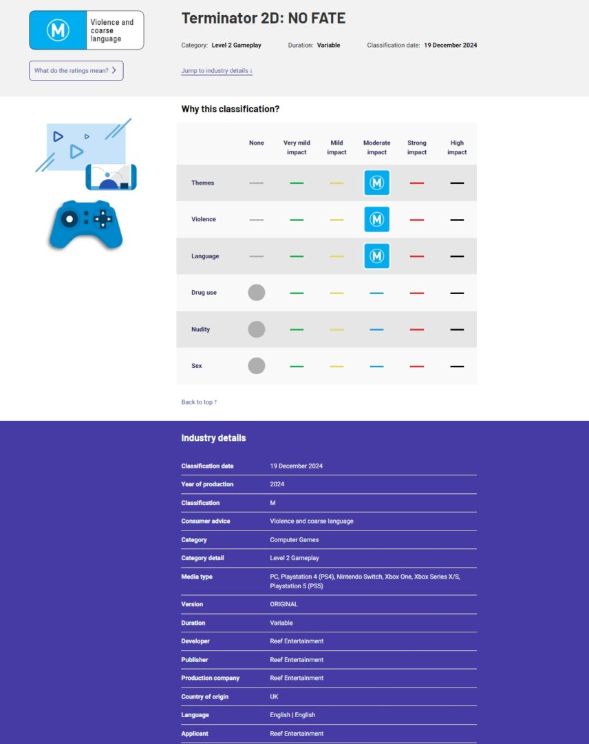 Niewykluczone, że Terminator otrzyma kolejną grę. Miałaby ona, jak sugeruje tytuł, być utrzymana w dwuwymiarze i nosić podtytuł NO FATE. Szczegóły nie są jeszcze znane, ale wygląda na to, że produkcja ta będzie należała do portfolio Reef Entertainment. Warto przypomnieć, że studio to stworzyło między innymi grę Terminator: Resistance. Mieliśmy okazję recenzować ten tytuł, a do odpowiedniego artykułu zabierze Was ten odnośnik. Natomiast niżej możecie przyjrzeć się szczegółom zaklasyfikowanej niedawno gry. Zrzut ten uchwyciłem na stronie Classification.gov.au.