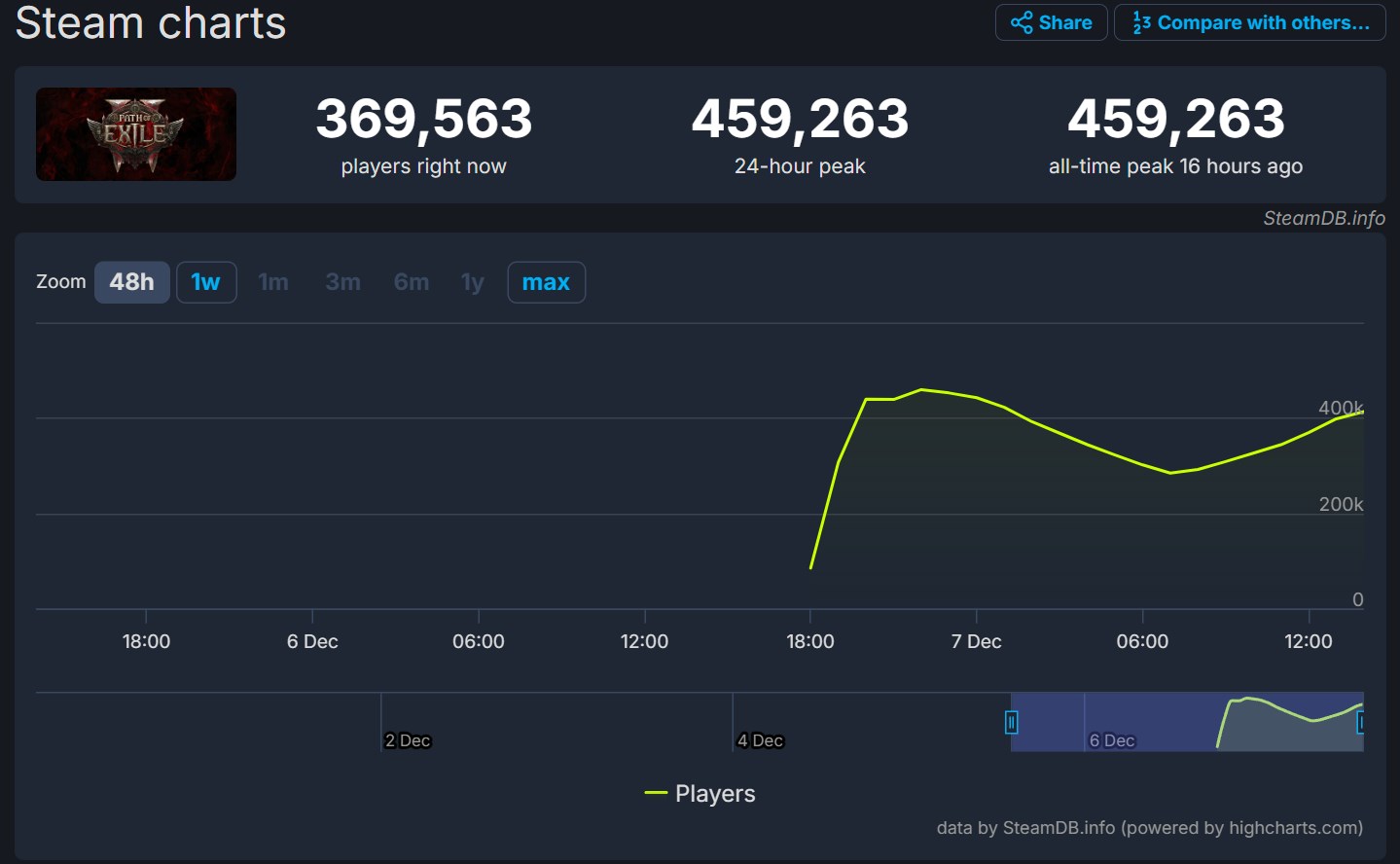 Wyczekiwane przez rzesze fanów RPG akcji Path of Exile 2 zadebiutowało wczoraj o 20:00 we wczesnym dostępie. Miało to miejsce jednocześnie na wszystkich wspieranych platformach. Early access oferuje między innymi sześć klas postaci, zróżnicowaną zawartość dostępną po ukończeniu wątku fabularnego oraz kanapową kooperację. Tytuł obsługuje także cross-play, a poczynione postępy pozostają jednakowe bez względu na zmianę platformy w trakcie gry. Pakiety Wsparcia Path of Exile 2 zaczynające się od 130 zł możecie kupić na oficjalne stronie gry. Kliknij TUTAJ, aby się tam udać. Jak widzicie na poniższym obrazku, 460 tysięcy graczy jednocześnie odpaliło PoE 2 w ciągu 24h.