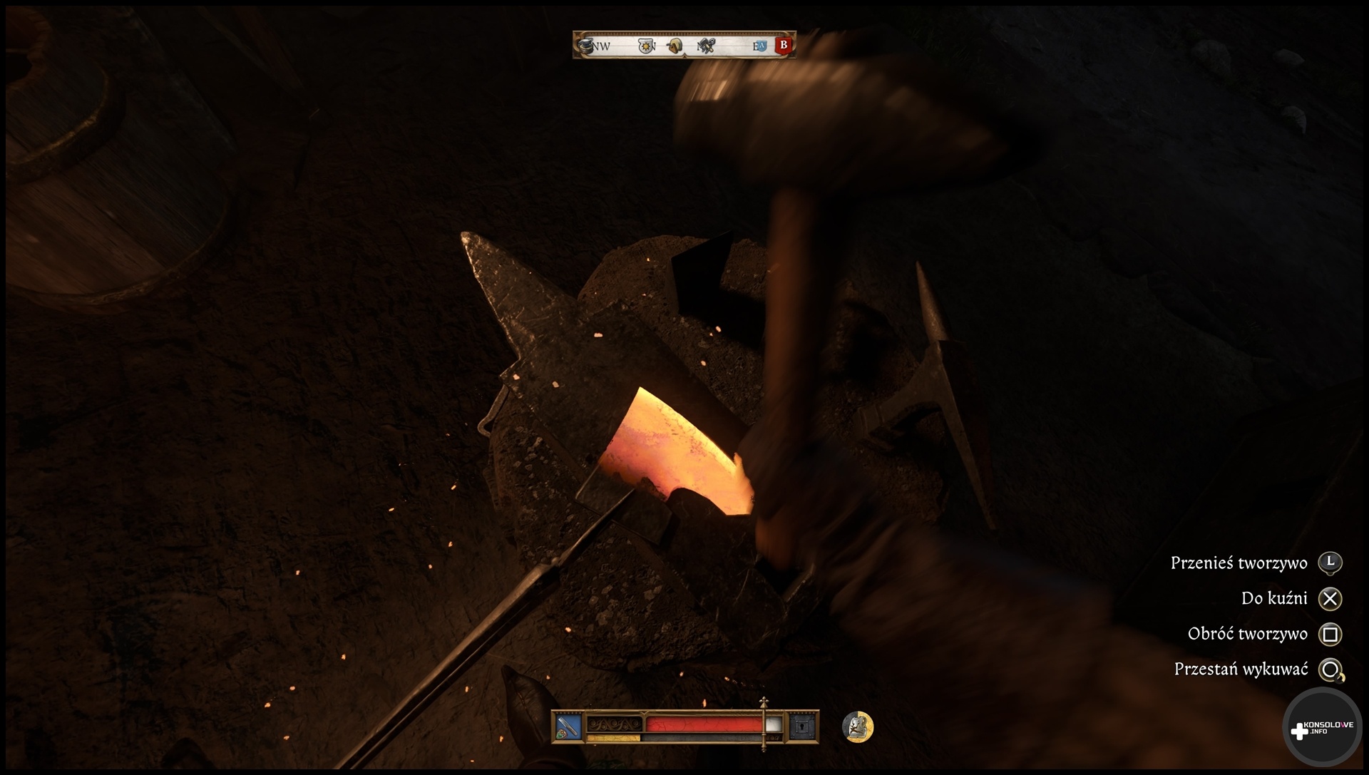 Bierzemy więc metal, wsadzamy go do paleniska i odpowiednio długo (oraz z właściwych stron) nagrzewamy. Gdy osiągnie właściwą temperaturę, udajemy się z metalem do kowadła i metal młotem. Im mocniejsze, regularniejsze i odpowiednio umiejscowione uderzenia, tym lepszy będzie przedmiot, który wykonamy. Na koniec hartujemy go i już jest gotowy. Kowalstwo bardzo mnie wciągnęło i na pewno będę rozwijał tę umiejętność, dalej przechodząc grę. Muszę jednak wspomnieć o pewnych problemach technicznych – zdarzało się bowiem, że metal przenikał kowadło, co wyglądało dość kuriozalnie. Niekiedy też nie było widać dość satysfakcjonującej animacji wody i pary podczas zanurzania w przedmiotu w cieczy. Mam nadzieję, że będzie to jeszcze poprawione przed premierą.