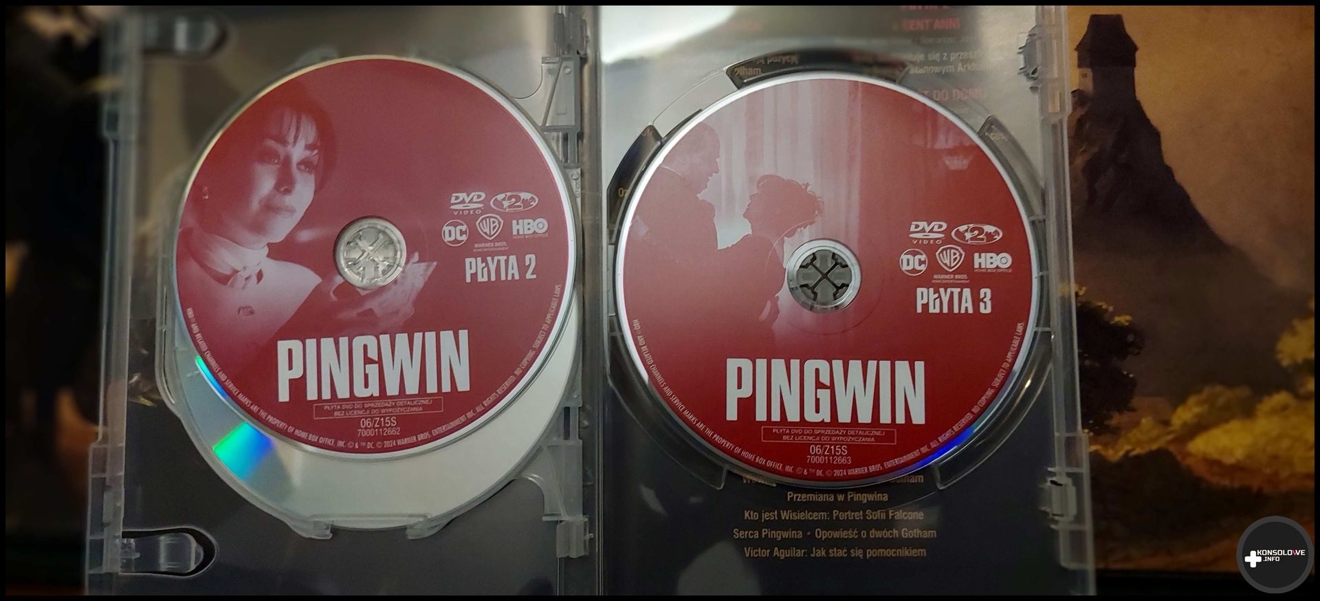 Pierwszym, co rzuca się w oczy (przynajmniej było tak w moim przypadku) jest pewna informacja, którą możemy dostrzec już na okładce. Okazuje się bowiem, że serial wydano na trzech płytach DVD. Dlaczego nie na jednej Blu-ray? Nie wiem niestety, ale prawda jest taka, że w moim przekonaniu trzy nośniki DVD odczuwalnie odróżniają tak zwany binge watch. Jeśli chcielibyście po prostu włożyć płytę do czytnika i obejrzeć cały serial za jednym posiedzeniem, nie ruszając się z kanapy, to z oczywistego względu jest to niemożliwe. Plusem natomiast w mojej ocenie są materiały dodatkowe, aczkolwiek więcej na ten temat napiszę nieco później. Teraz wrócę do samego wydania. Zarówno front, jak i tył prezentują się naturalnie bardzo ładnie, aczkolwiek nie o tym należy jeszcze wspomnieć. Doceniam mianowicie, że na wewnętrznej stronie okładki znajdziemy krótkie opisy wszystkich odcinków. Z pewnością przyda się to osobom, które chciałyby wrócić do konkretnego wątku czy sceny. Zwłaszcza, że odcinki są też podzielone na płyty. Pod względem formatu wydania serialu Pingwin oprócz rodzaju nośnika i związanych z tym konsekwencji nie mam więc zastrzeżeń.