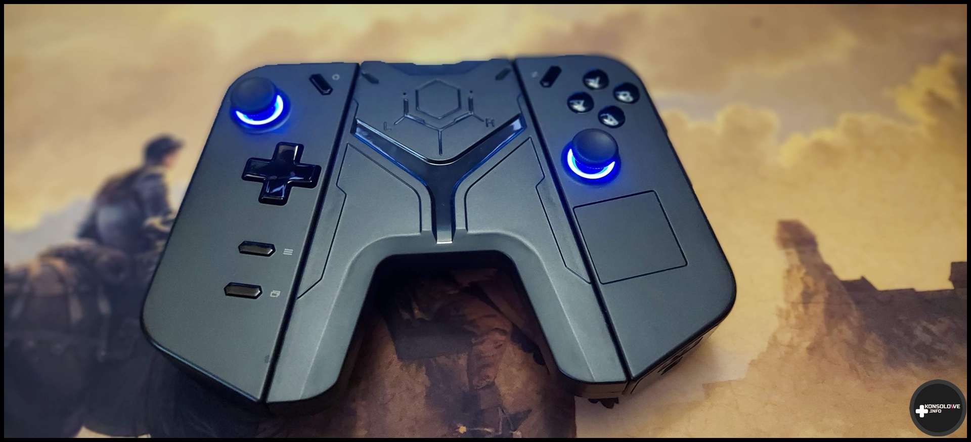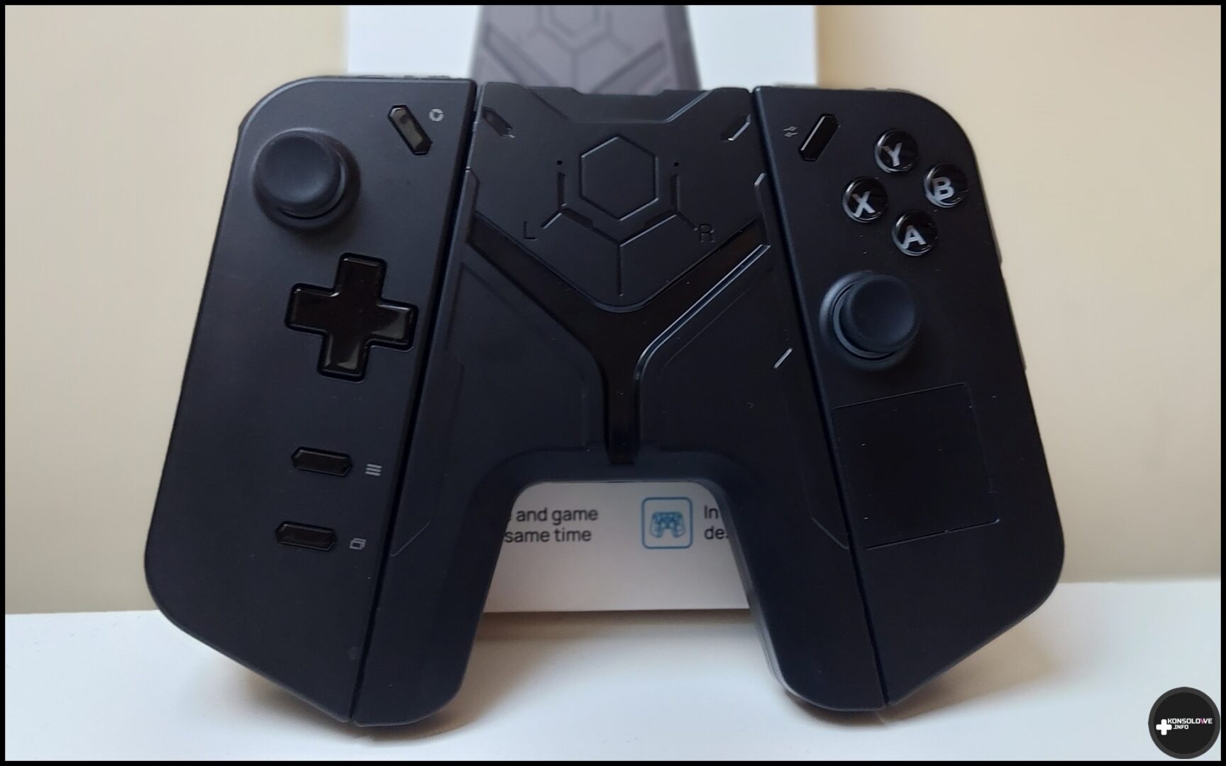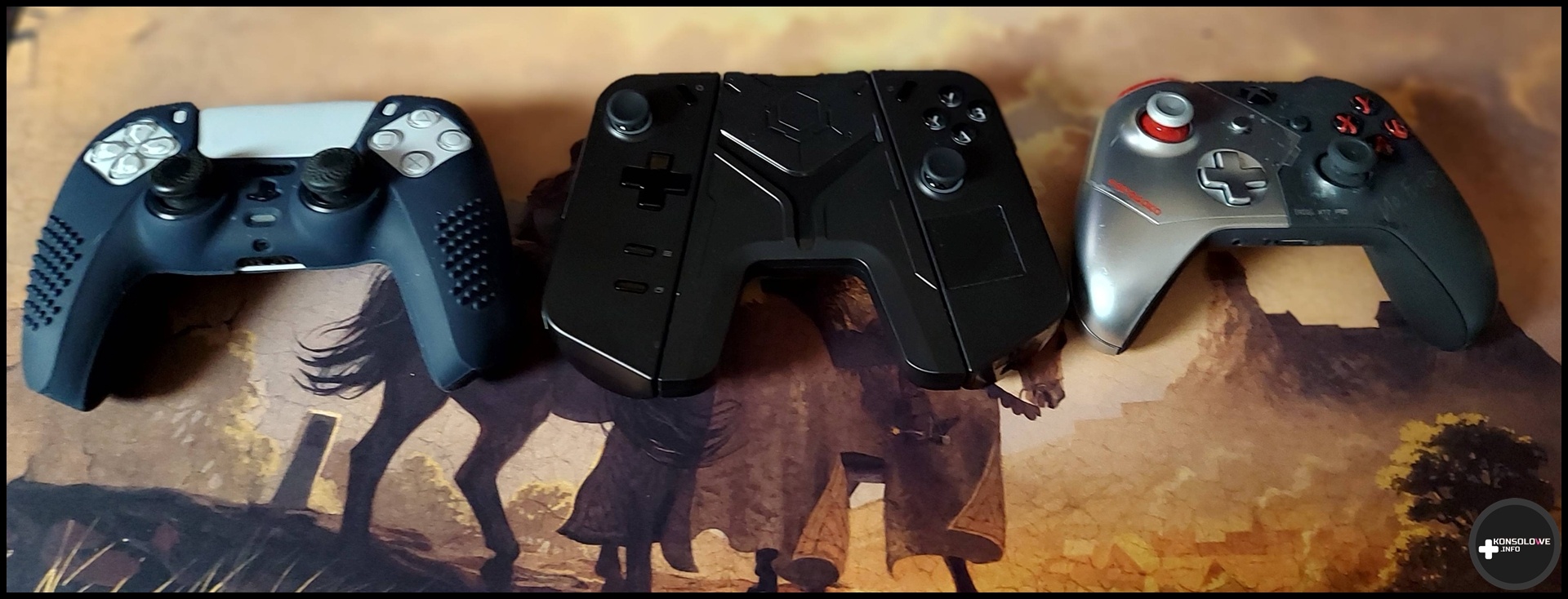 Uchwyt, który dziś dla Was testuję posiada na bokach właściwie takie same szyny, jak ekran komputera Lenovo Legion Go. Identycznie osadzamy w nich kontrolery, a przełączając odpowiednie “dźwigienki” na kontrolerach zwalniamy blokadę. Następnie możemy, dokładnie tak samo jak w przypadku Lenovo Legion Go, wysunąć kontrolery z szyn. Nie mam do tego żadnych zastrzeżeń, każdy użytkownik wspomnianego kontrolera poczuje się jak w domu. Sam uchwyt jest lekki, co w mojej ocenie jest jego zaletą. Podobnie zresztą jak rozstaw ramion kontrolera – po wsunięciu do niego w „listwy” bliźniacze z tymi z boków komputera otrzymamy dość duży kontroler. co możecie zobaczyć niżej. Na zdjęciu znajdziecie porównanie między rozmiarem tak otrzymanego kontrolera, a DualSensem i padem z Xboxa.
