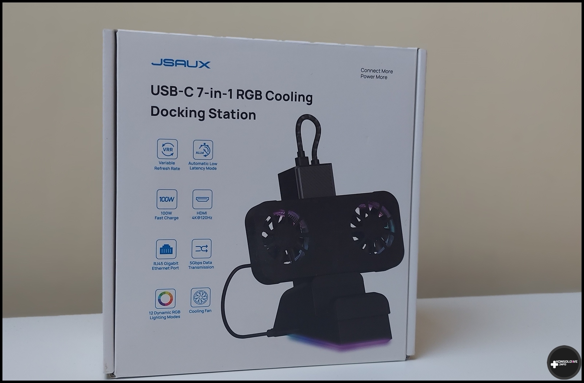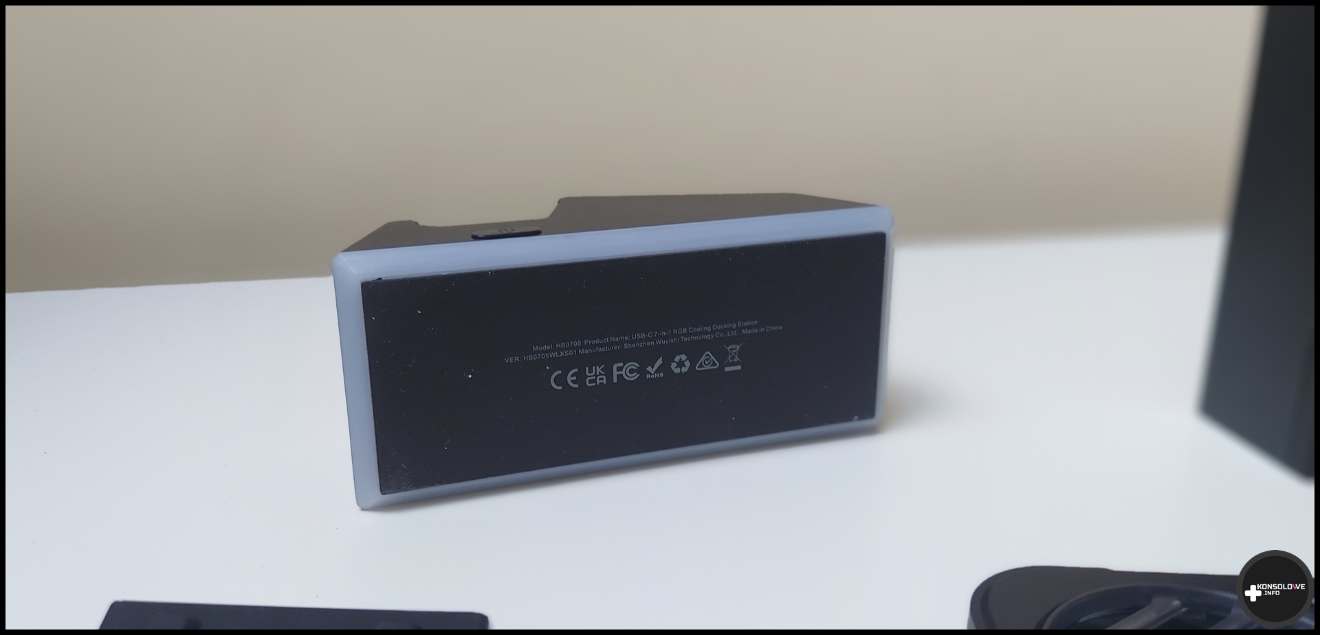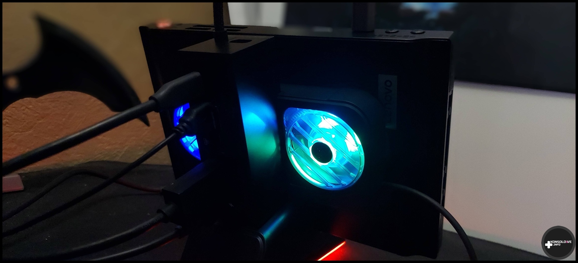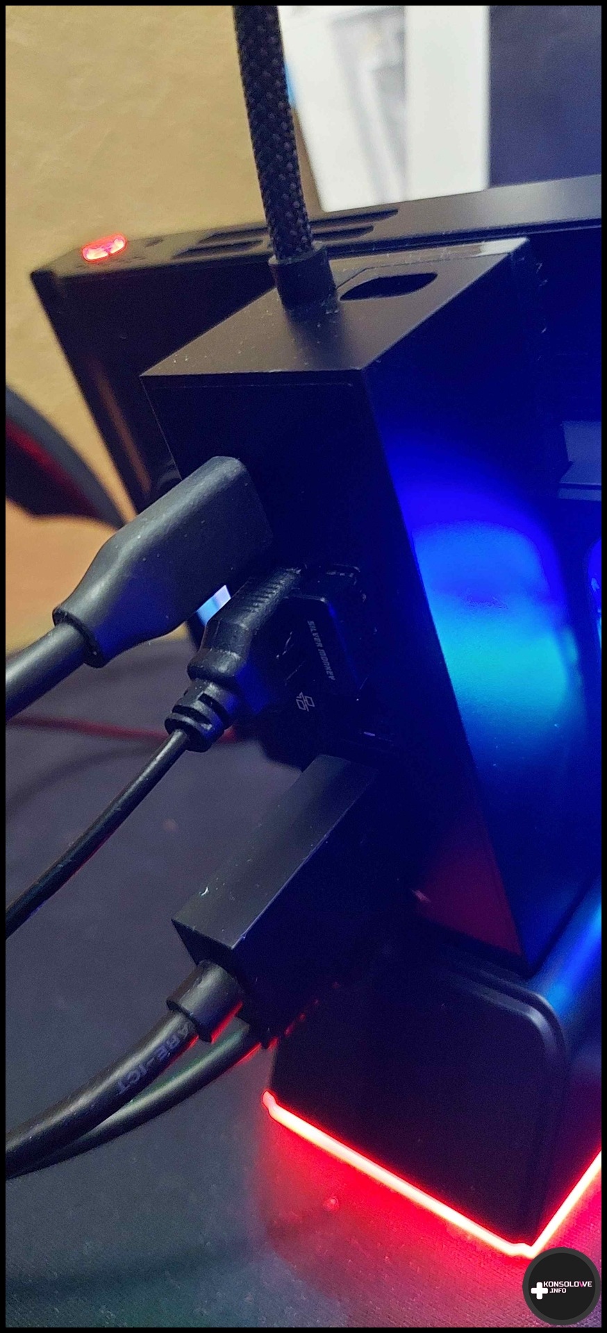Wróćmy jednak do grania w połączeniu z tą stacją dokującą. Jak na pewno pamiętacie, wspomniałem wcześniej, że „słup” posiada magnetyczną część, a w podstawie stacji znajduje się gniazdo USB. Warto więc bardziej rozwinąć tę kwestię. W zestawie ze stacją znajdziemy wentylator RGB, który możemy zamontować na stacji. Miejsce dla niego jest dedykowane właśnie na tej magnetycznej części stacji, a podłączamy go do wspomnianego portu USB. Wentylator posiada podświetlenie, które możemy przełączać i wyłączać przyciskiem zlokalizowanym na boku wentylatora. Podobnie wypada sprawa z podświetleniem bazy stacji. Po włączeniu wentylatora od JSAUX temperatury CPU spadały o około 5 – 10 stopni Celsjusza. Jest to więc bez wątpienia przydatne akcesorium – zwłaszcza w kontekście grania w bardziej wymagające produkcje.