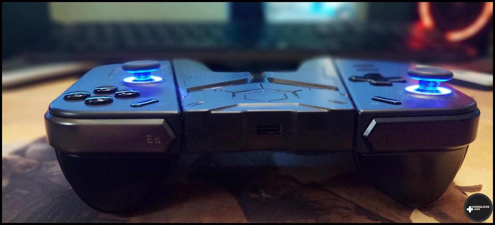 Za pomocą zlokalizowanego na górze uchwytu portu USB C możemy ładować kontrolery osadzone w uchwycie. Pełne naładowanie to czas rzędu około 2 godzin, a więc całkiem przyzwoicie. O ładowaniu informują nas delikatne diody na górze frontu akcesorium. Zielone oznaczają w pełni naładowane kontrolery, natomiast czerwone – ładowanie. Jeżeli lubicie granie na Lenovo Legion Go, ale nie chcielibyście zawsze szukać specjalnego pada, to zdecydowanie warto zainteresować się tym produktem. Zwłaszcza, że bez problemu można go podłączyć kontaktu czy powerbanku. Dodatkową zaletą jest design wizualny. Wyżłobienia na froncie nadają temu akcesorium świetny, nieco agresywny i elegancki, wygląd.