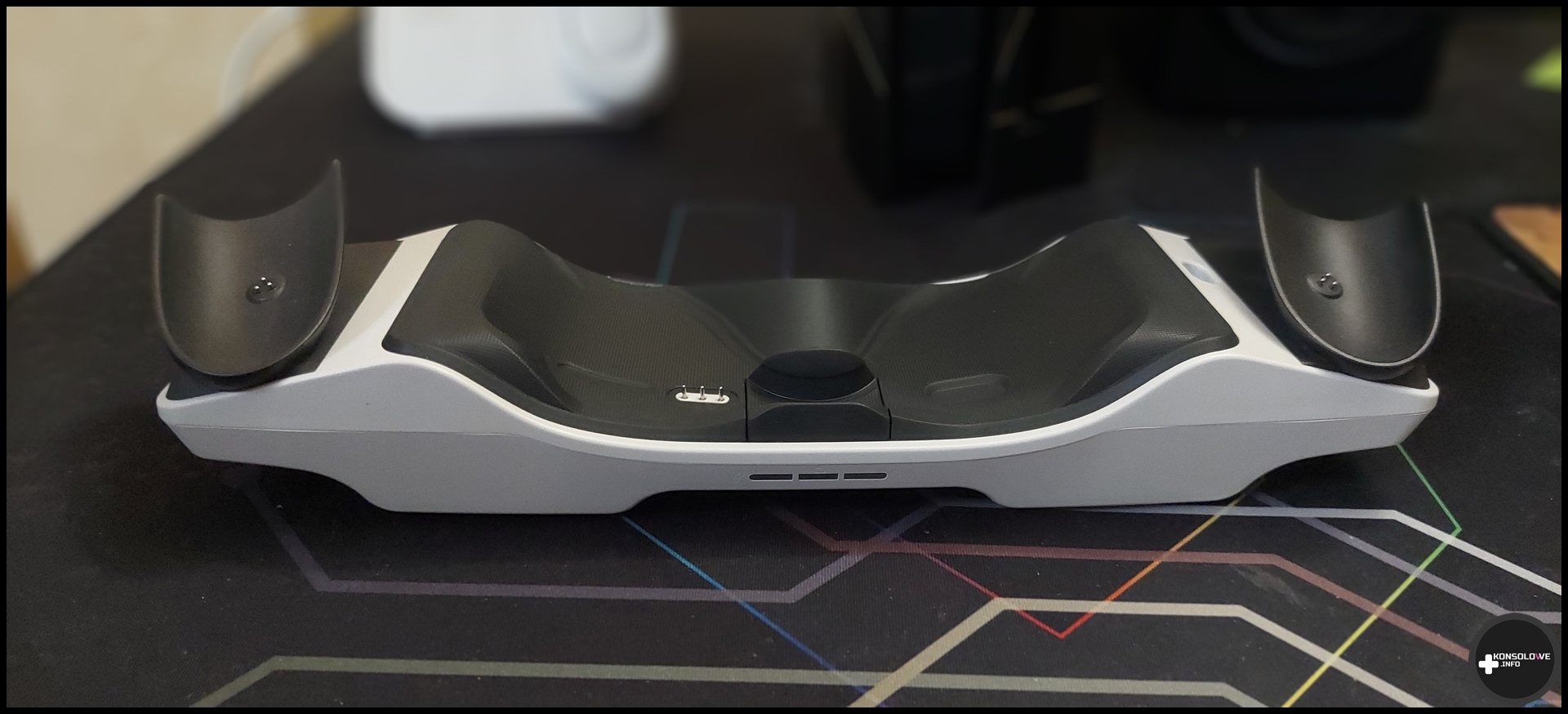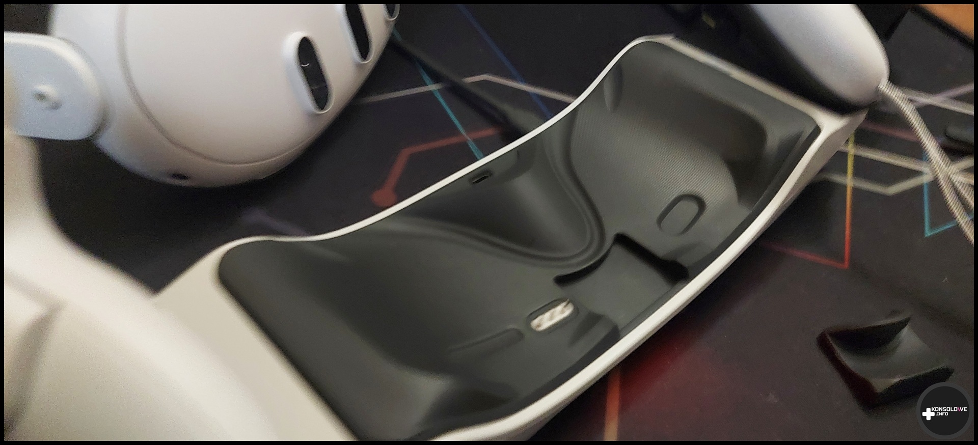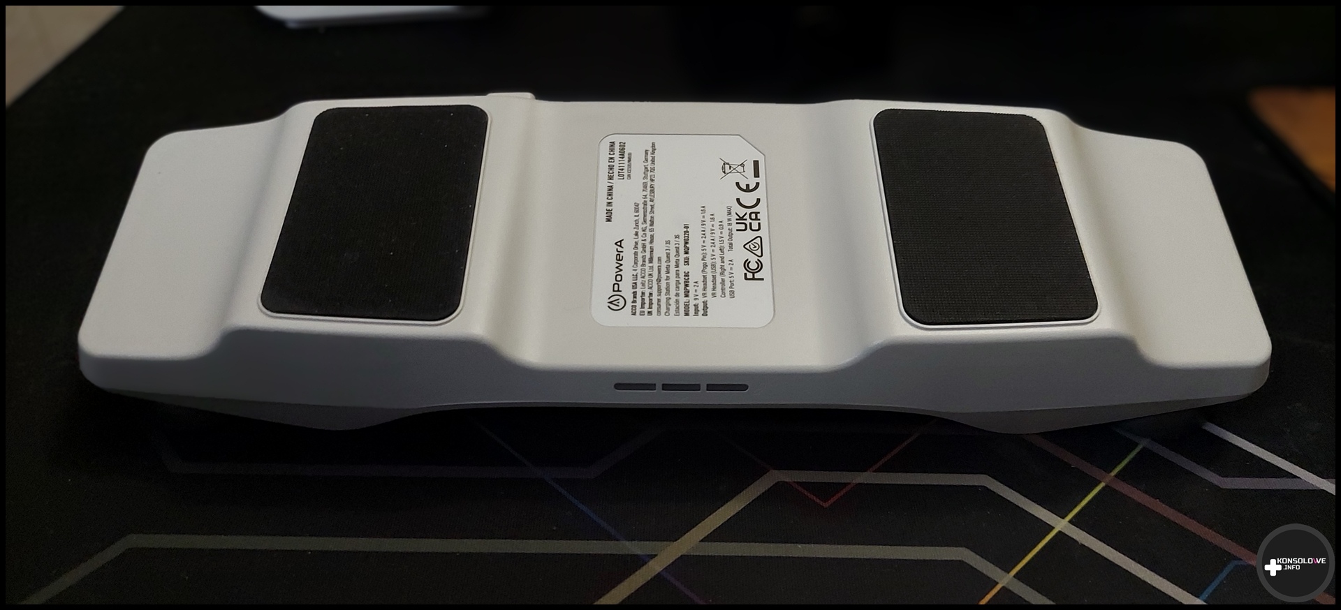 Pierwszym krokiem dla wielu z nas z pewnością byłoby przyjrzenie się stacji dokującej. Na jej spodzie znajdują się dwa stopery, dzięki czemu stabilnie trzyma się ona podłoża – zarówno bez materiałowej maty, jak i z nią. Co do stabilności stacji nie mam absolutnie żadnych zastrzeżeń. Nie porusza się ona niezależnie od tego, czy kładziemy na niej gogle i kontrolery, czy zdejmujemy sprzęty (pod różnym kątem). Pod tym względem nie powinniście więc mieć powodów do narzekań. Stację musimy oczywiście podłączyć do prądu, aczkolwiek PowerA nie oferuje w komplecie zasilacza. Jasne, można uważać, że jest on zbędny, skoro znajdziemy go przecież w opakowaniu z goglami Meta Quest 3. Ja jednak jestem zdania, że jeśli ktoś zapewnia kabel, to zasilacz również byłby wysoce wskazany. Zwłaszcza, że – jak już pisałem – testowana stacja nie należy do najtańszych.