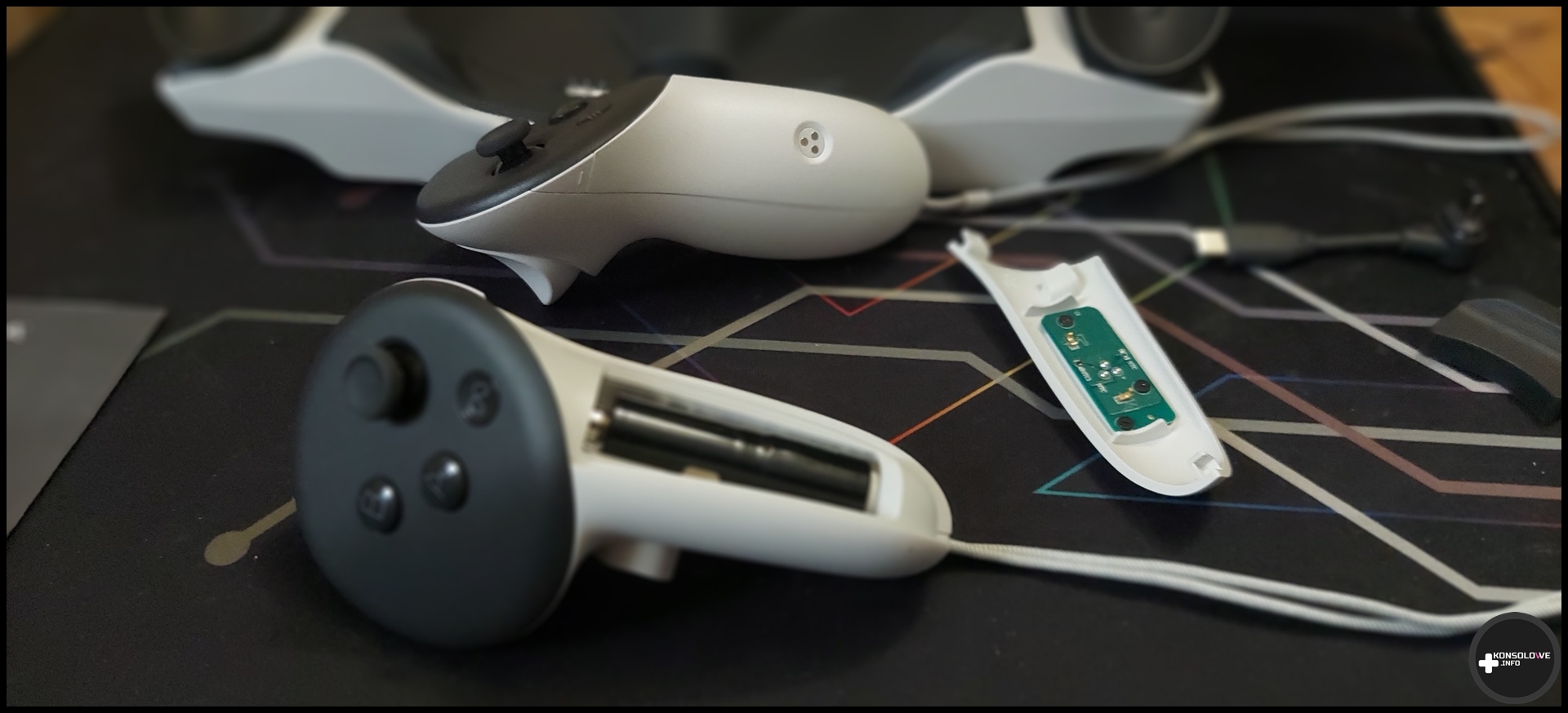 Skuszony więc zapowiedzią bardziej rozbudowanych instrukcji w kilku wersjach językowych zeskanowałem kod QR z wydrukowanej instrukcji… i przeszedłem do strony z dokładnie tą samą instrukcją; nie różniła się ani na jotę. Był to dla mnie pewien zawód, ale zdawałem sobie jednocześnie sprawę, że nie to jest oczywiście głównym bohaterem opakowania. Sięgnąłem więc głębiej i znalazłem dość długą (mierzącą około 29 cm) stację ładowania (z zamontowanymi na stałe „łódkami” na kontrolery), kabel (USB C do USB C) oraz kilka nasadek. Więcej na ten temat dowiecie się z następnej części dzisiejszego testu.