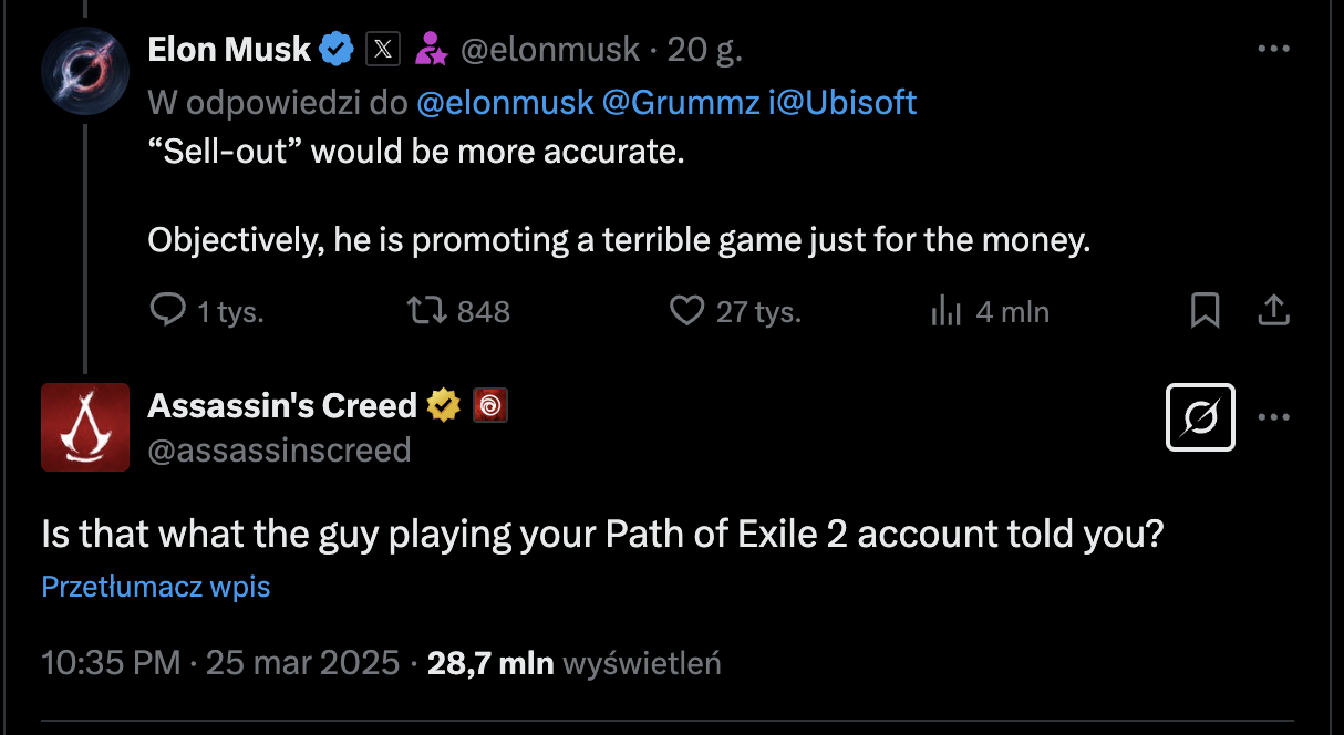 Ubisoft tym razem wstał i wybrał przemoc. Dla części osób kontekst tej odpowiedzi może być niejasny, więc już wyjaśniamy: jakiś czas temu Elon Musk chwalił się, że jest jednym z najlepszych graczy w Diablo IV i Path of Exile 2. Wielu graczy podchodziło do tych deklaracji sceptycznie. Ostatecznie Musk przyznał, że wynajmował profesjonalnych graczy, którzy grali na jego koncie.
