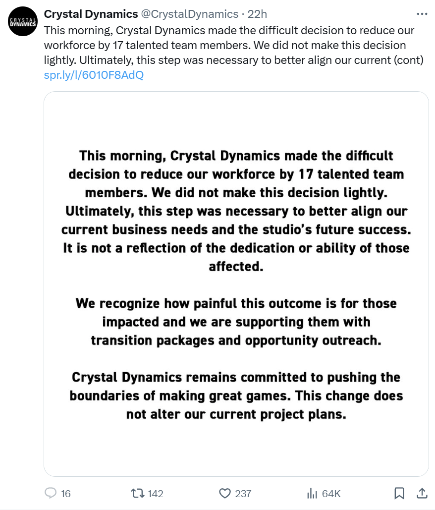 Crystal Dynamics podziliło się dziś informacją o zwolnieniach w ich szeregach. W ramach redukcji pracę straciło 17 osób.