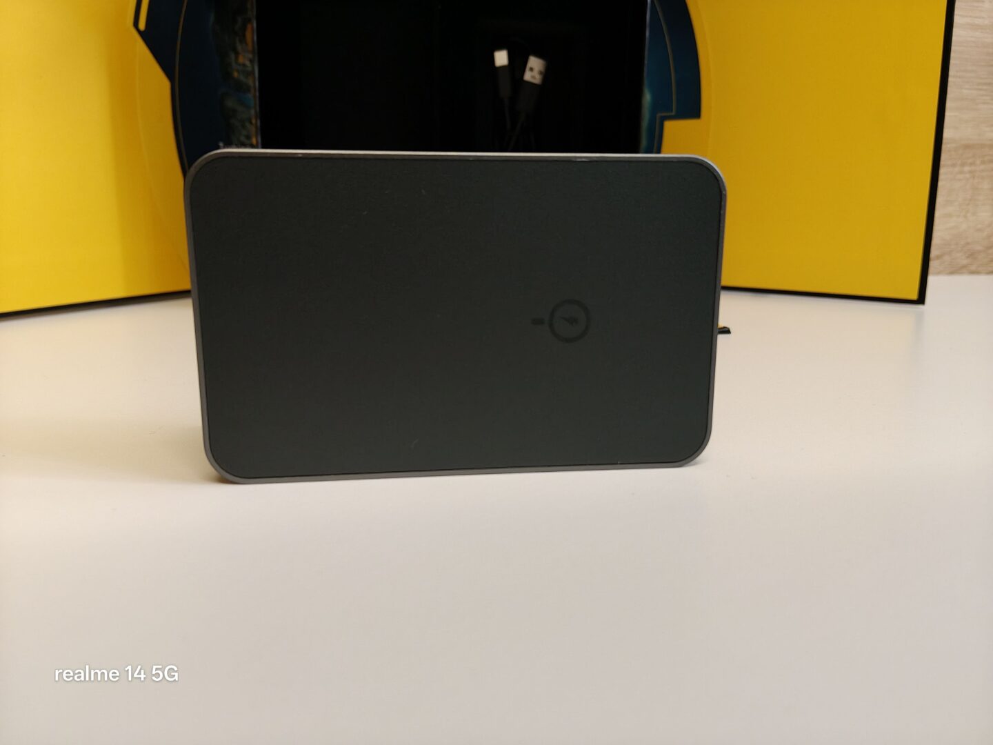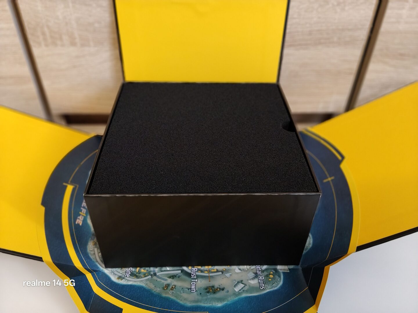 To koniec prezentów, choć nie koniec zawartość pudełka realme 14 5G X Free Fire Edition. Pociągając za dwie tasiemki, ramiona pudełka rozłożą się na boki, dając nam dostęp do czarnego pudełka z tajemniczą zawartością. Tą tajemniczą zawartością są dwa bardzo przydatne akcesoria! Jest to powerbank o pojemności 6000 mAh, który może ładować smartfon bezprzewodowo oraz… wentylator chłodzący. Wentylator możemy zamontować na pleckach naszego smartfona, aby lepiej rozprowadzać ciepło urządzenia. W tym zestawie znajdują się również dwa kable USB-A – USB-C.