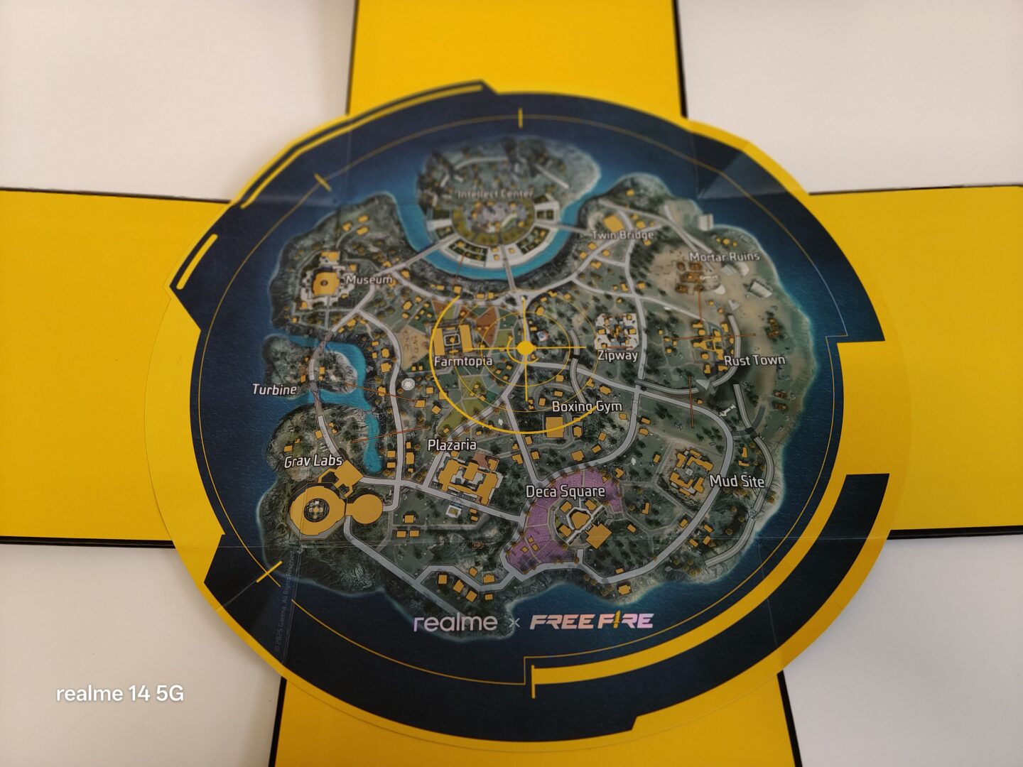 Miłym zaskoczenie po usunięciu wszystkich pudełek jest ujrzenie mapy z gry Free Fire wraz z nazwami wszystkich najważniejszych lokacji. Fani gry z pewnością docenią te detale. Przejdźmy teraz do samego smartfonu, który także zawiera unikatowe detale dla fanów gamingu.