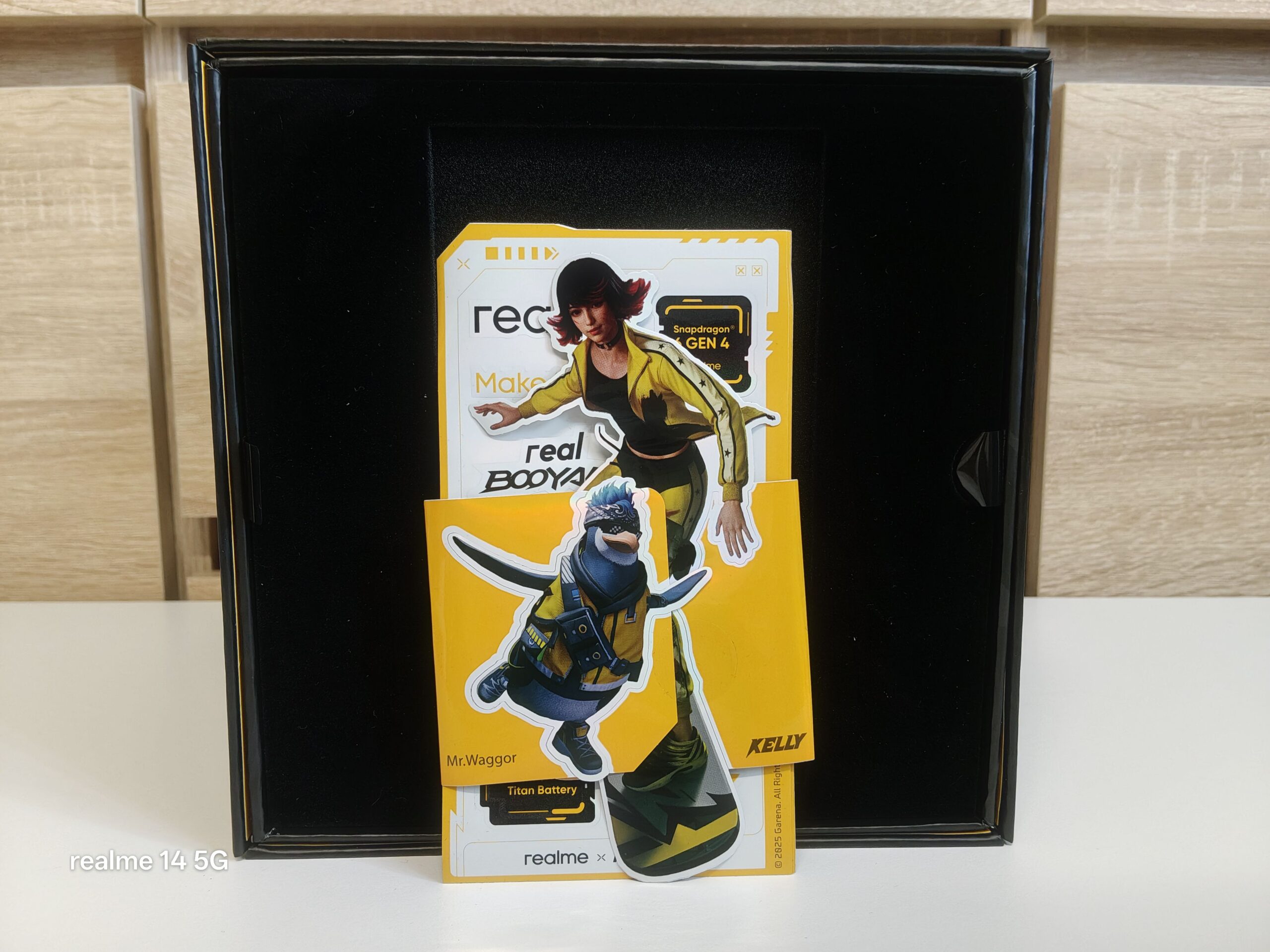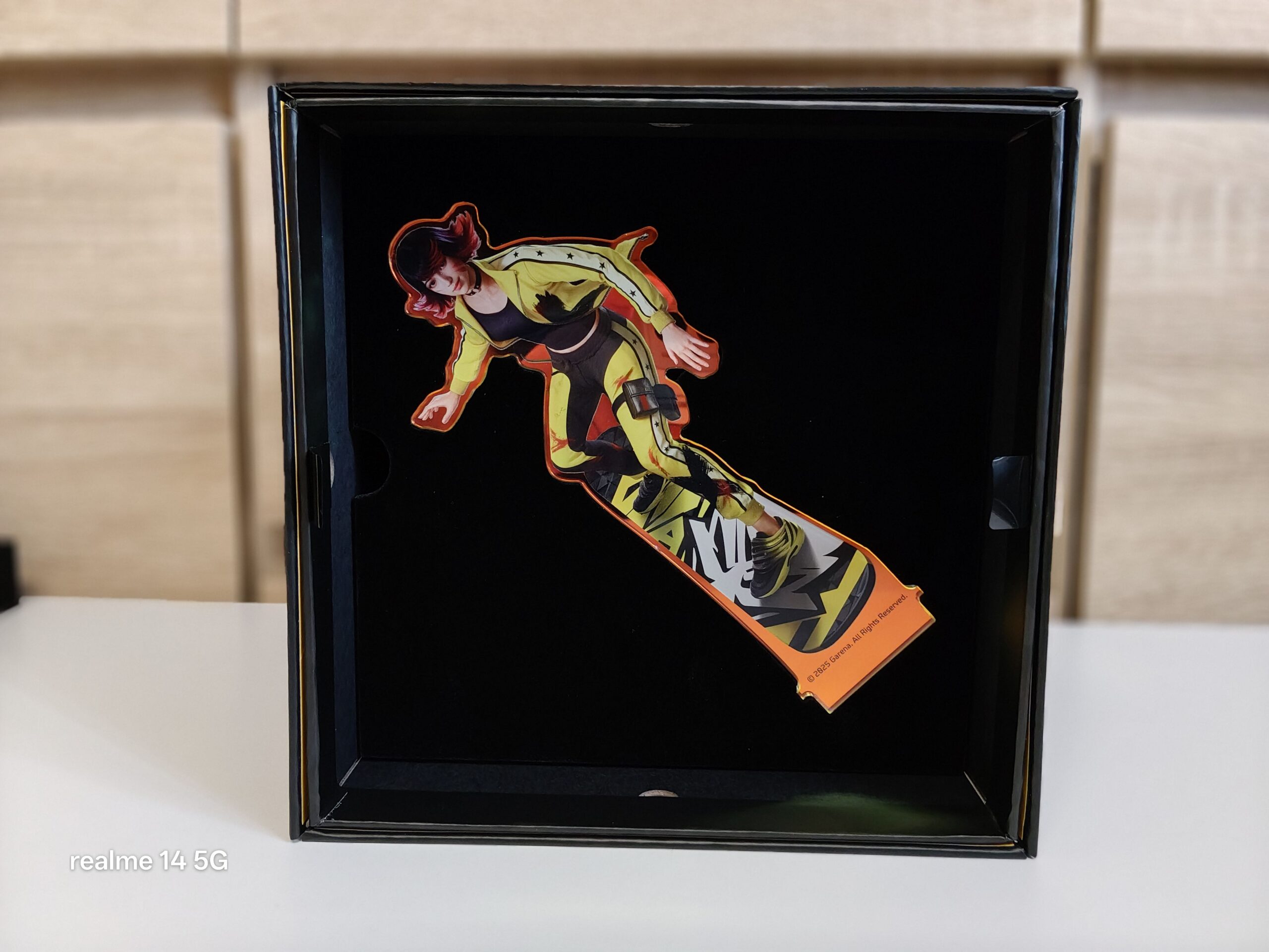 Pod listem mamy pierwszy prezent, są to trzy arkusze naklejek związanych z grą Free Fire oraz najnowszym smartfonem realme. Pod naklejkami ukryto jedną dużą naklejkę z wizerunkiem Kelly, która została naniesiona na odpowiednio wycięty kawałek przezroczystego plastiku. W kolejnej warstwie znajdziemy podstawkę z dużym logo real BOOYAH!. Umieścimy w niej wspomnianą naklejkę Kelly oraz dodatkowy element z logo realme x Free Fire.