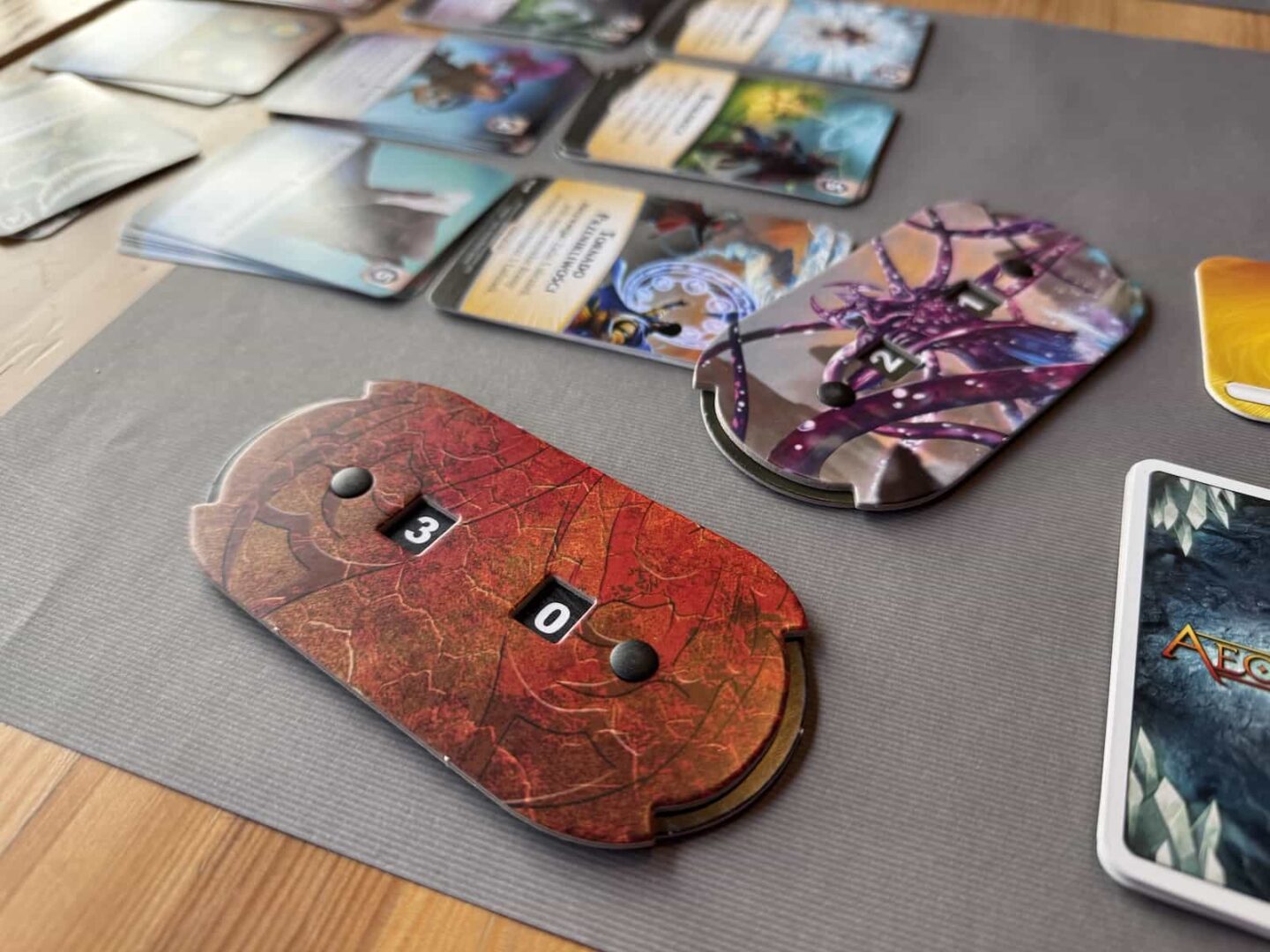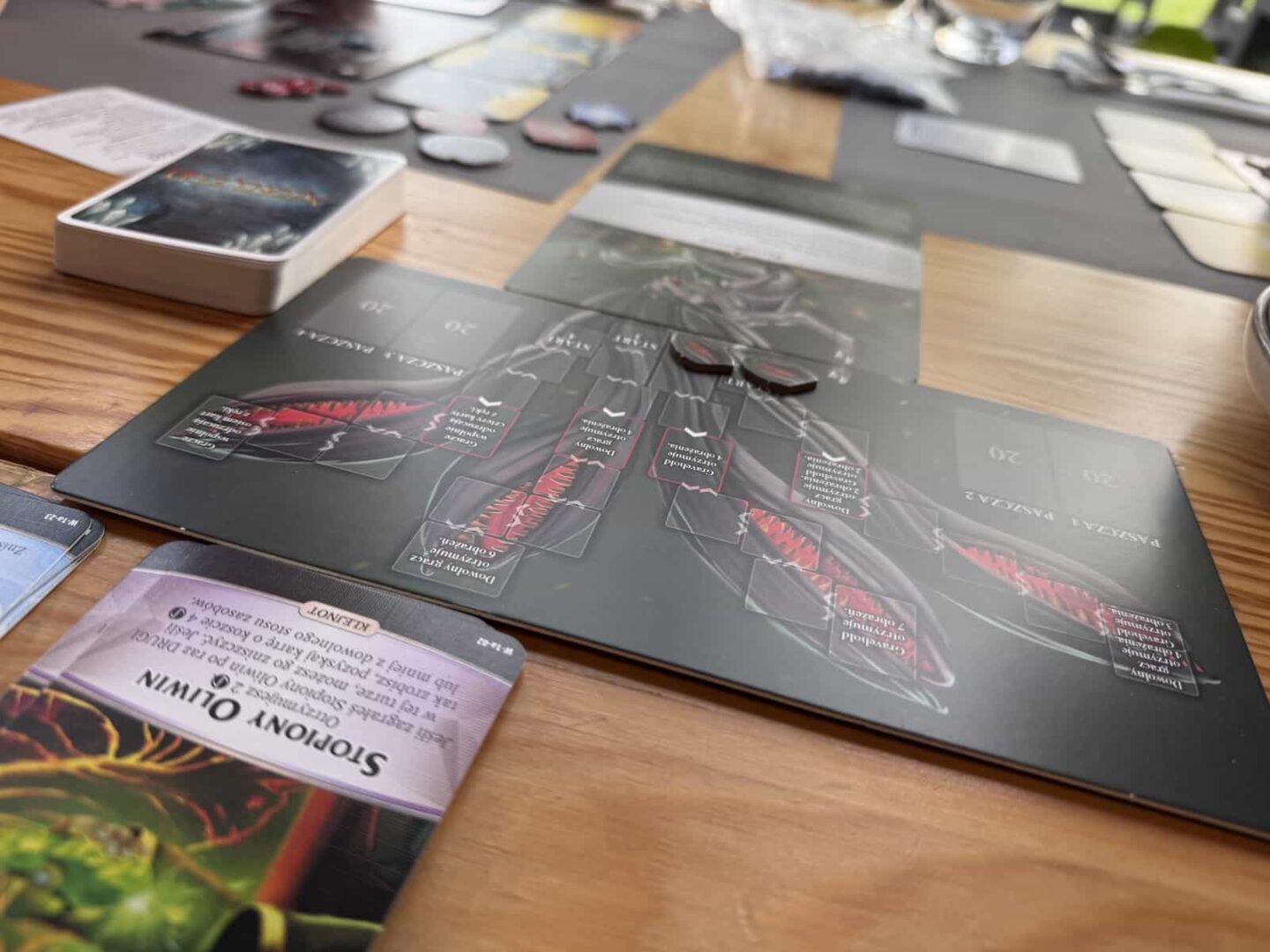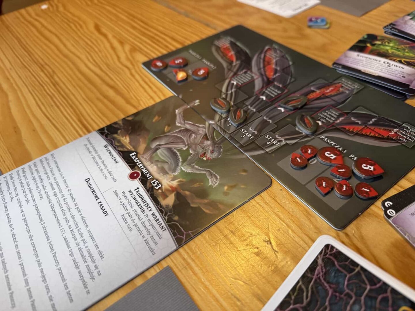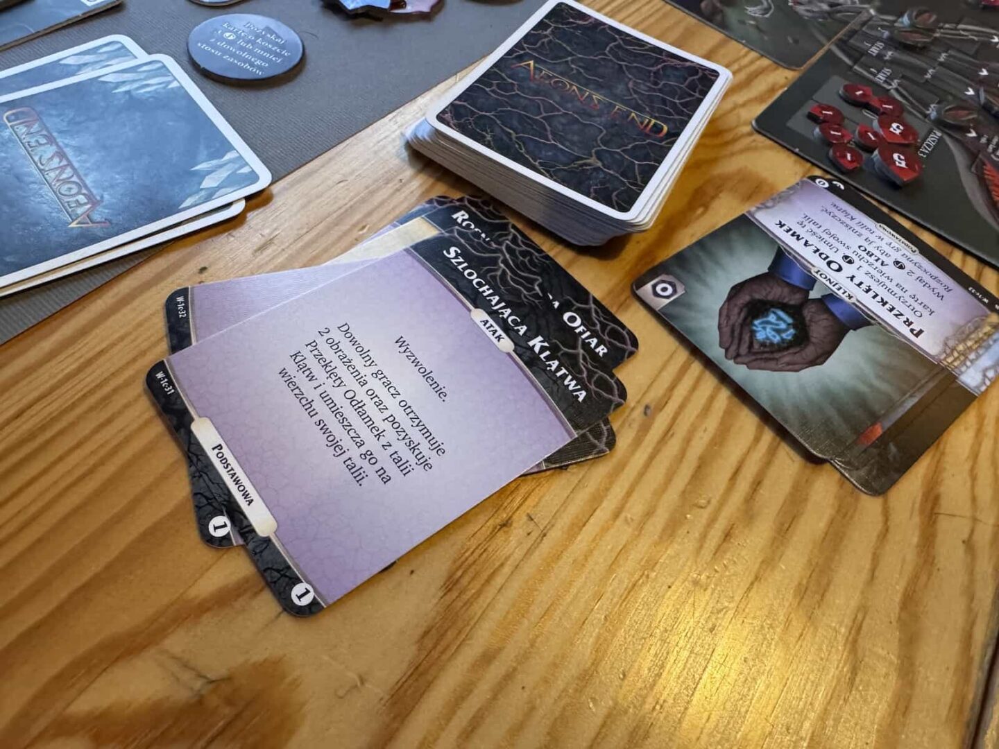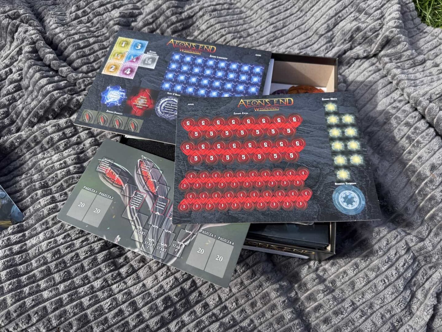 Powinienem jednak powiedzieć, że drugi znacznik spełnia taką funkcję w innych wersjach Aeon’s End, gdyż w Wygnańcach życie wroga mierzymy za pomocą wspomnianej planszy ewolucji paszcz. Nie mam nic przeciwko dołączaniu dodatkowych elementów w pudełkach gier. Rozumiem też, że dzięki temu gracze będą gotowi na rozgrywanie własnych scenariuszy. Boli natomiast fakt, że instrukcja w żadnym miejscu nie podkreśla, że ten znacznik nie jest elementem głównej kampanii gry. Wprowadziło to niepotrzebne zamieszanie, w którym moi gracze dziwili się, że nie korzystamy ze wszystkich elementów niebędących specjalnie oznaczonymi taliami. Nie jest to zresztą jedyne przewinienie owej instrukcji.