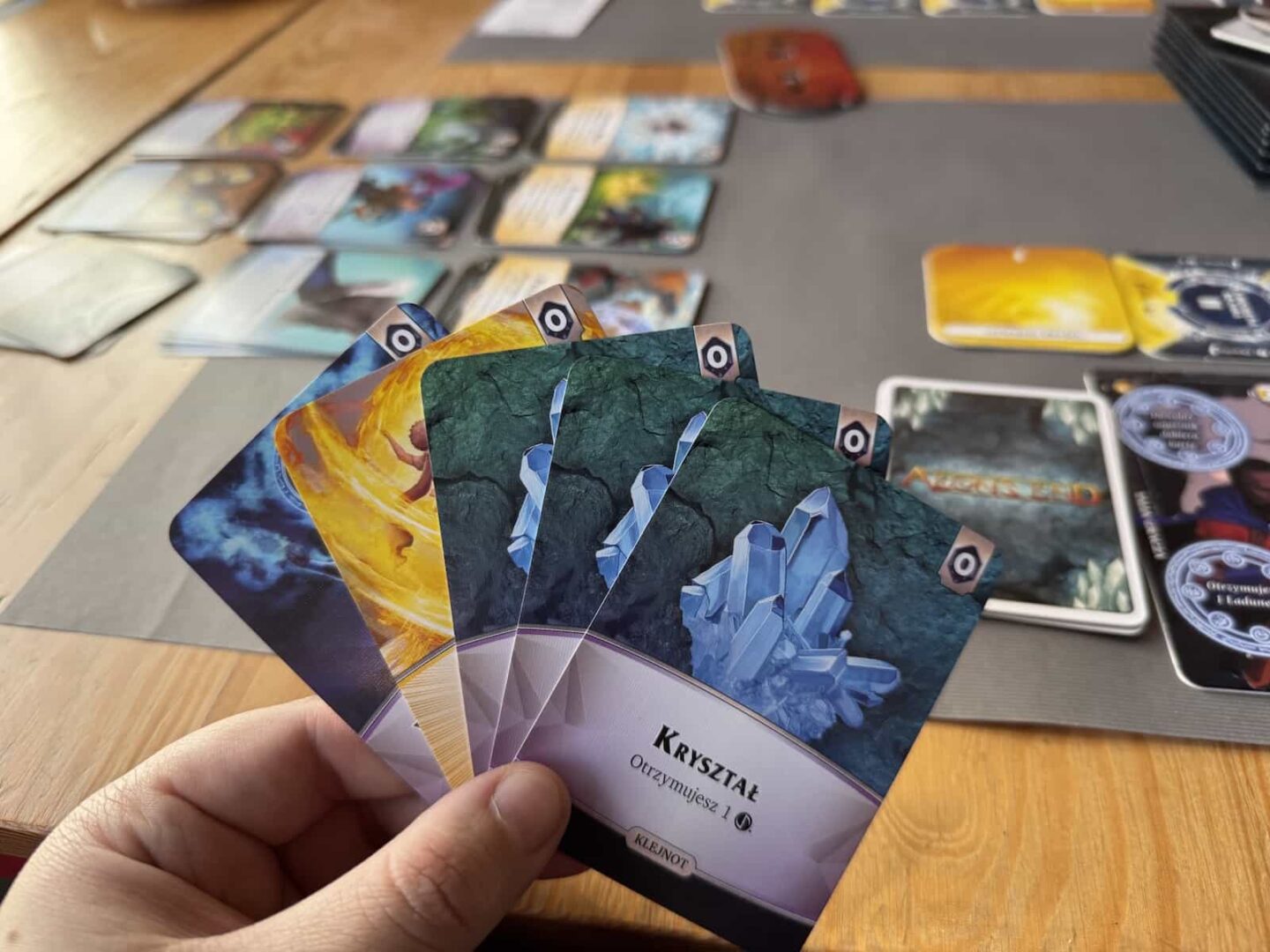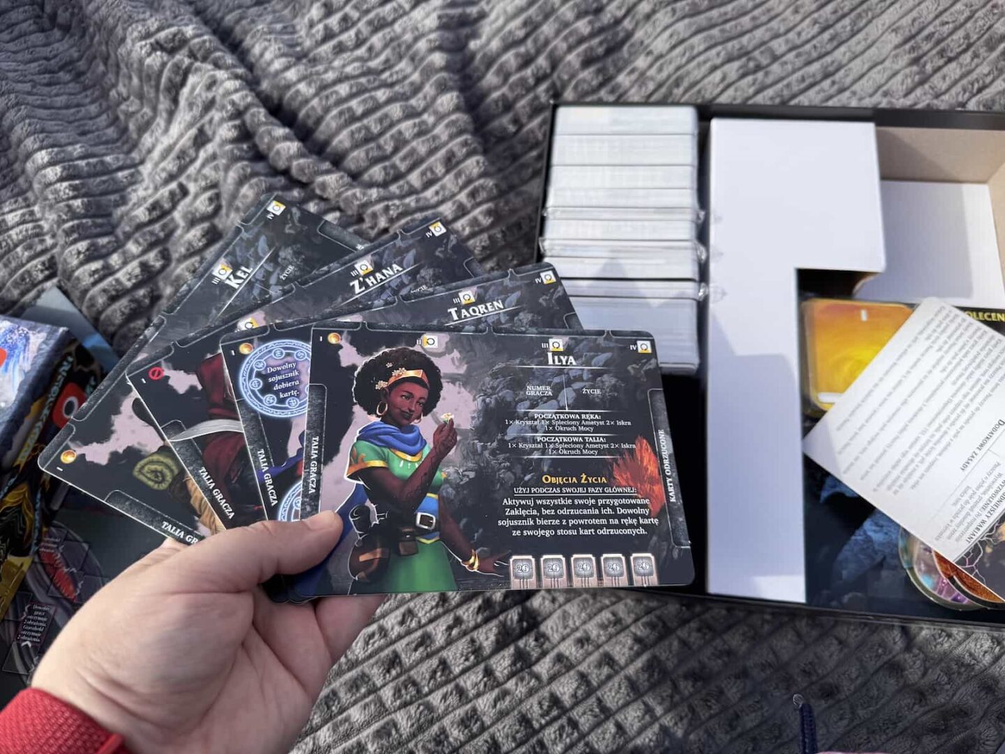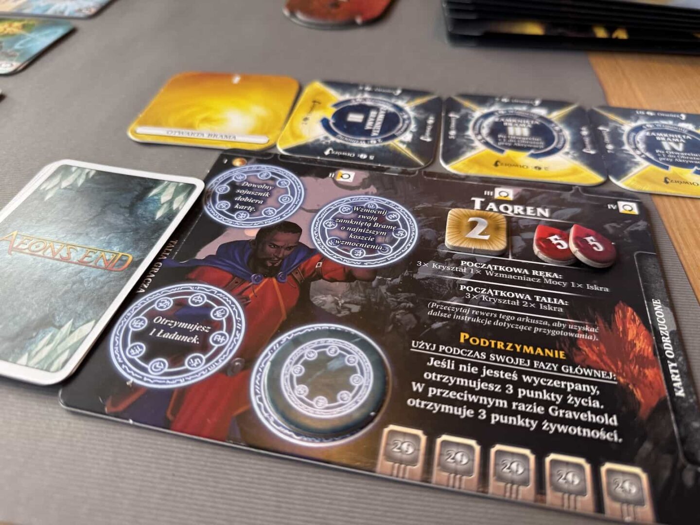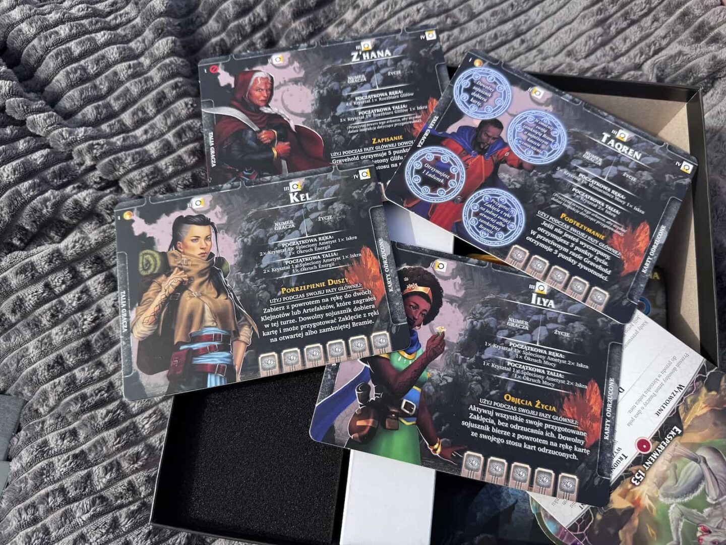 No dobra, ale jak wygląda sama rozgrywka w Aeon’s End: Wygnańcy? Każdy z grających wpierw wybiera jedną z czterech dostępnych postaci. To ważna decyzja, gdyż unikatowe umiejętności bohaterów w sporym stopniu zmieniają rozgrywkę. Mamy tu Taqrena – czarodzieja wspierającego drużynę przyjmując na siebie obrażenia. Z’Hana to rzeźbiarka glifów, dzięki którym zyskamy rozmaite efekty wykupując karty z rynku. Ilya dobrze rozegraną ręką zada wielkie obrażenia, a Kel wspiera ją za pomocą dodatkowych kryształów i reliktów.