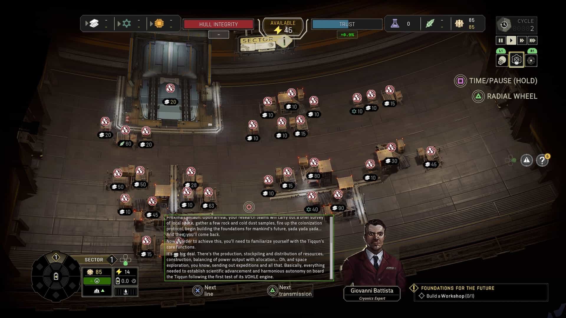 Narracja prowadzona jest poprzez komunikaty od sztucznej inteligencji, interakcje z radą stacji oraz wydarzenia losowe, które zmuszają gracza do podejmowania trudnych decyzji. Często zresztą takich, gdzie nie ma dobrego rozwiązania.