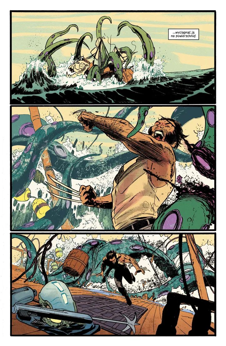 Jak już wspomniałem komiks Rządy X. Wolverine. Tom 2 to zbiór trzech osobnych opowieści. Co ważne nie musimy znać wcześniejszych wydarzeń z serii komiksów Świata X. W sumie tylko na samym początku mamy odniesie do jednego z wydarzeń z ogromnego albumu Rządy X. Hellfire Gala. Pierwsza historia dotyczy Marudera jednego z ogromnych jachtów mutantów, który przewoził drogocenny ładunek. Jacht zaginął. Z czasem znaleziono jego wrak, jednak ładownia była już pusta. Zbadanie sprawy z ramienia X- Force powierzono Loganowi, który w pewnym stopniu zabawi się w detektywa. Rosomak odkrywa, że z napadem są powiązani wyjęci spod prawa mutanci z wyspy Arakko. Od tego momentu akcja nabiera tempa, a nasz Rosomak nie raz za pomocą swoich szponów będzie musiał dociec prawdy.
