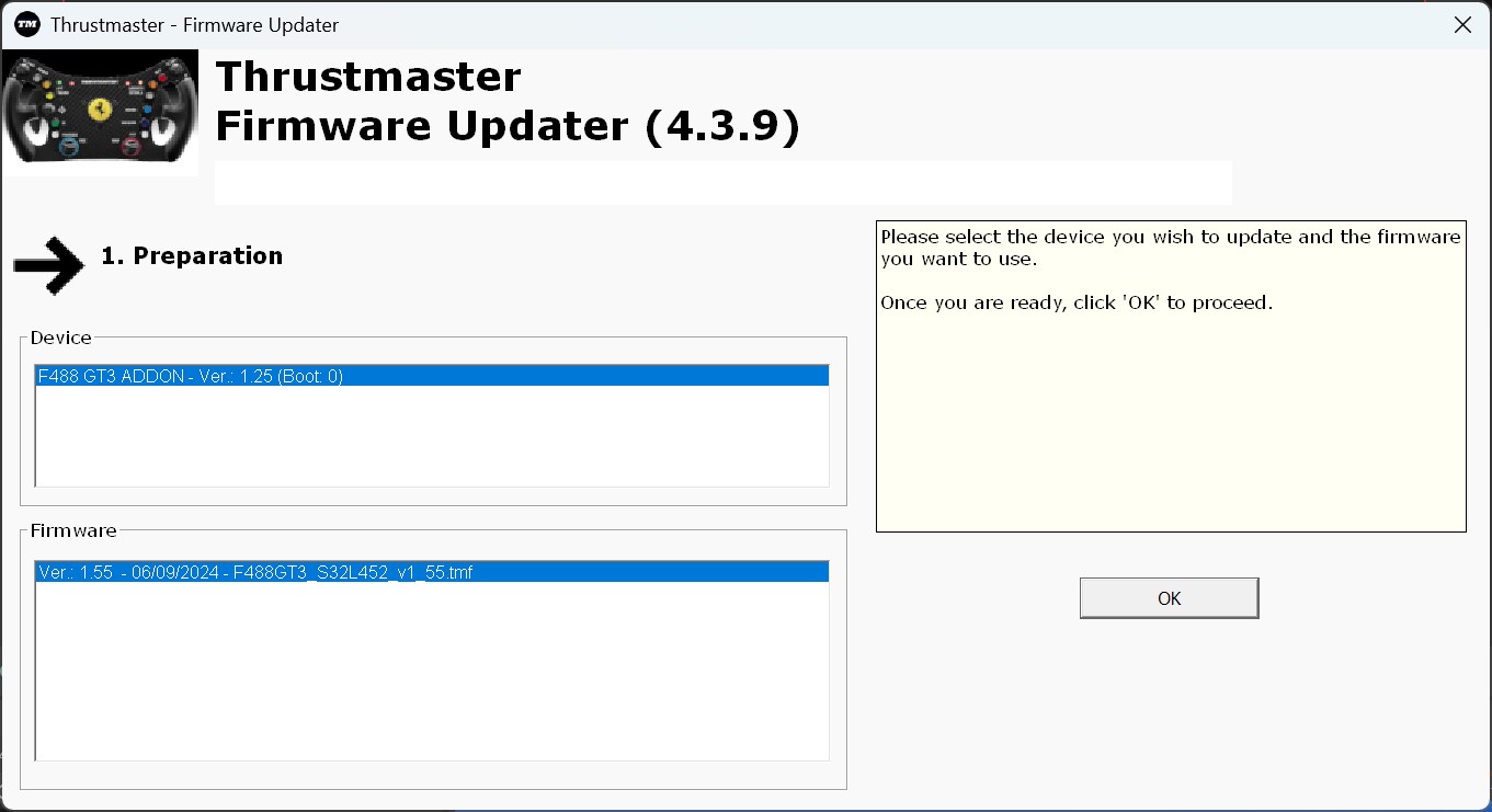 Tuz po wyjęciu Ferrari 488 GT3 Wheel Add-On z pudełka należy od raz kierownicę zaktualizować. Nie nakładamy w tym momencie żadnego z dwóch uchwytów do bazy, gdyż zasłonimy sobie gniazdo USB-C. Ze strony producenta pobieramy aplikację THRUSTMASTER FIRMWARE UPDATER. Instalujemy na PC i uruchamiamy — najlepiej z prawami administratora. Teraz jedną końcówkę kabla USB podłączamy do PC, a drugą do kierownicy, klikami OK. Po aktualizacji odłączamy kabel USB i podłączamy go ponownie. To wszystko, nasza kierownica od tego momentu posiada najnowsze oprogramowanie.