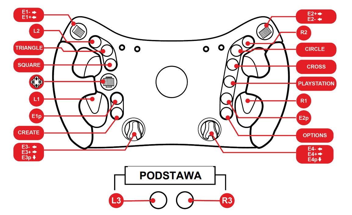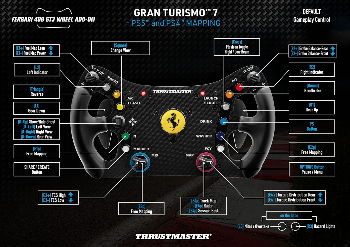 Dodatkowo na stronie producenta znajdziemy już gotowe plansze z mapowaniem do najpopularniejszych gier. Poniżej możecie zobaczyć domyśle przypisanie przycisków w takich grach jak Gran Turismo 7 i Assetto Corsa Competizione na PS5. Oczywiście w ustawieniach gry możemy wszystkie przyciski przypisać według własnych potrzeb.