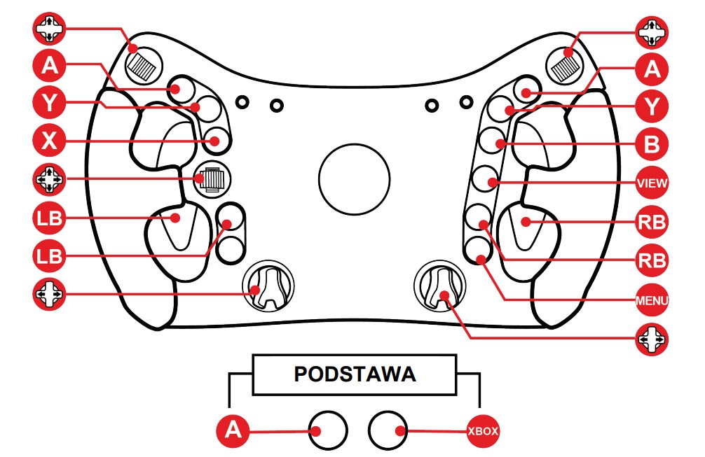 Ferrari 488 GT3 Wheel Add-On to uniwersalna kierownica, która działa z odpowiednimi bazami na PC, PS5/PS4 oraz konsolach Xbox. Stąd też nie ma na niej żadnych konsolowych oznaczeń, są tu opisy z prawdziwego sportowego samochodu, jakim jest Ferrari 488 GT3. Osobiście uważam, że dobrym pomysłem mogłoby być dodanie do zestawu naklejek z odpowiednimi przyciskami z kontrolerów PlayStation oraz Xbox. Moglibyśmy je nakleić na okrągłe przyciski kierownicy. A tak musimy się po prostu nauczyć i zapamiętać co gdzie jest według poniższych wzorów.
