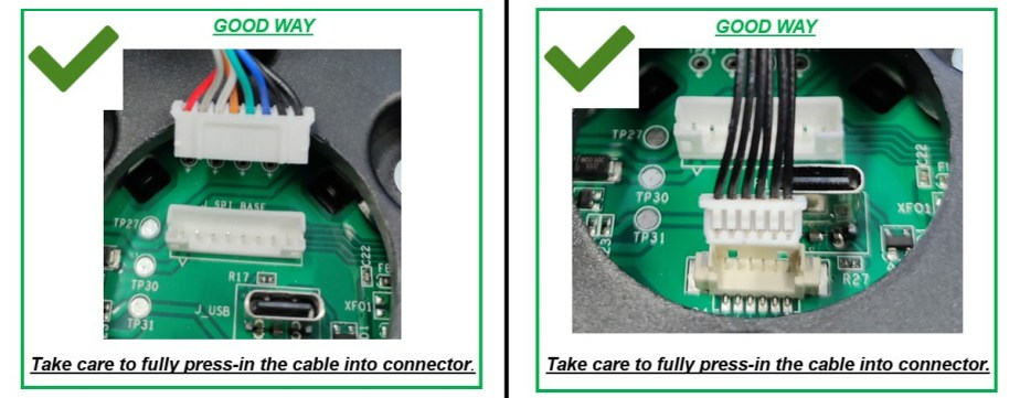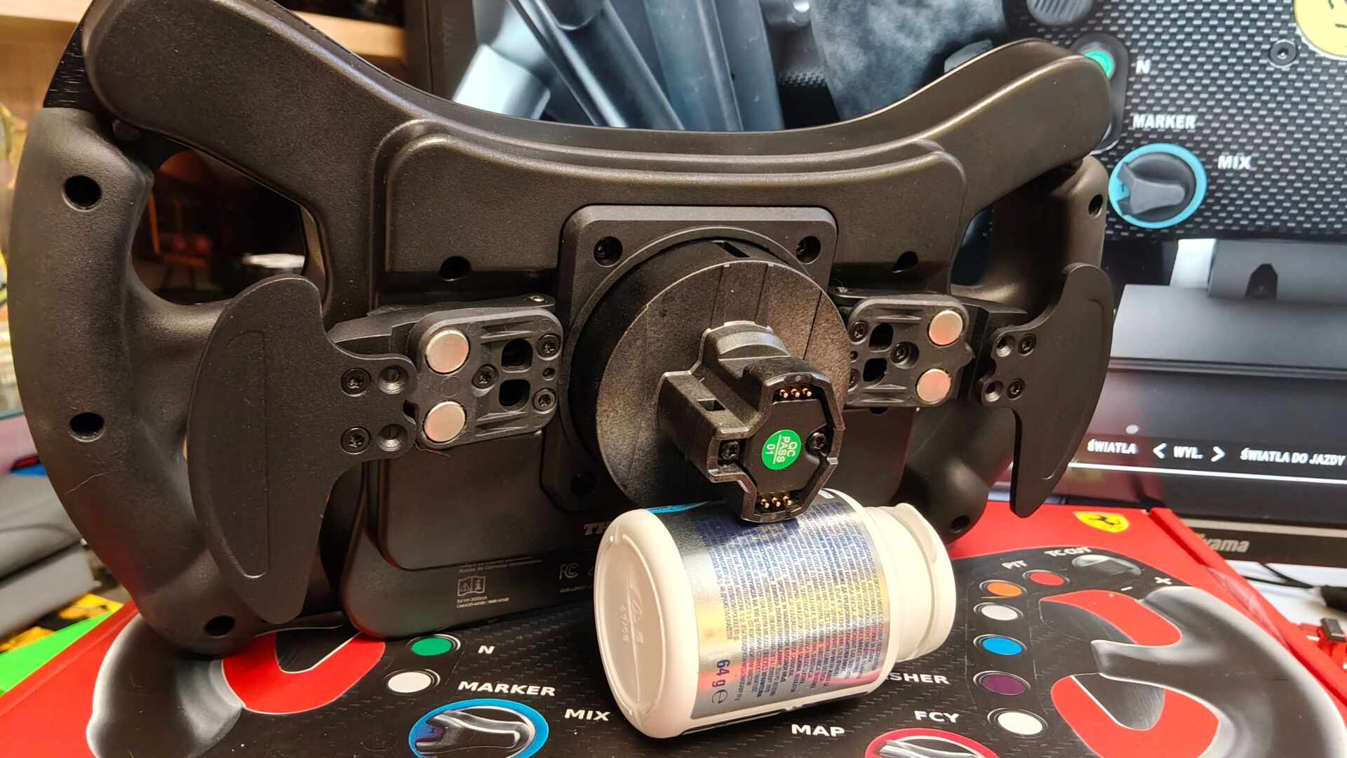 Po skończonej aktualizacji możemy zabrać się za montaż odpowiedniego uchwytu do kierownicy. Firma Thrustmaster w zestawie daje nam dwa uchwyty. Jeden z gwintem do starszych baz tego producenta, czyli m.in. T300RS, T-TG i T-GT II, które są kompatybilne z konsolami PS4/PS5. Jednak mnie najbardziej interesuje drugi uchwyt, to szybkozłączka kompatybilna z bazą T598 oraz wszystkimi innymi, które ukażą się w przyszłości. Uchwyt do bazy dopasujecie bez problemu, gdyż jedna z krawędzi ma dwa ścięte rogi. Jednak tuż przed zamontowaniem uchwytu musimy podłączyć kabelek do płyty głównej. Jeżeli nie wiesz, którą stroną podłączyć, to odpowiedni obrazki znajdziesz w instrukcji. Na koniec należy już tylko dokręcić cztery imbusowe śrubki. W zestawie jest oczywiście odpowiedni śrubokręt.