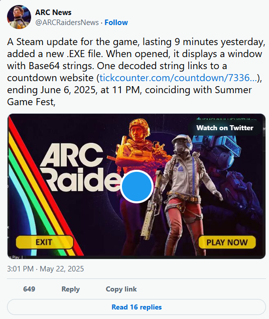 Według najnowszej “teorii spiskowej”, jest spora szansa, że grę zobaczymy już za dwa tygodnie! W plikach ostatniej aktualizacji gry na Steamie pojawił się plik .exe. W oknie dialogowym pojawił się kod zaszyfrowany base64, który po przetłumaczeniu był linkiem do strony z odliczaniem. Odliczanie na ten moment to 14 dni i kilka godzin, czyli wskazuje na 6 czerwca, godzinę 23 polskiego czasu. Czy to możliwe, że wtedy też ukaże się ARC Raiders?