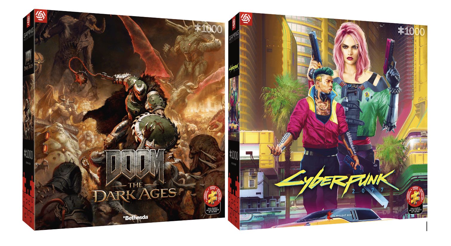 - Cyberpunk 2077: Kitsch Style (1000 elementów). Wprowadza puzzle w oświetlony neonami świat kontrastów – strzeliste drapacze chmur wznoszą się nad cienistymi zaułkami. Natomiast futurystyczna technologia zderza się z surową miejską szarością. Elektryzująca paleta kolorów i misterny design przeniosą Cię prosto do serca Night City.