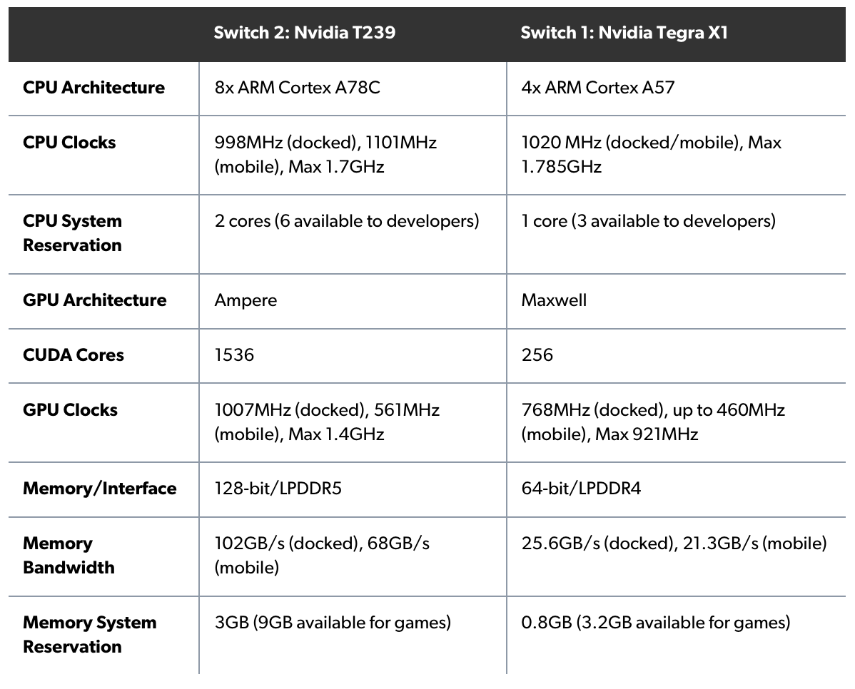 Switch 2 działa w oparciu o nowy układ Nvidia Tegra T239, wyposażony w ośmiordzeniowy procesor ARM Cortex-A78C. Z tej liczby sześć rdzeni jest dostępnych dla gier, a dwa dedykowane działaniu systemu. Konsola otrzymała także 12 GB pamięci RAM LPDDR5X, z czego 3 GB przeznaczono na potrzeby systemowe. To znaczący skok względem pierwszej generacji Switcha, co przełoży się na lepszą płynność działania gier.