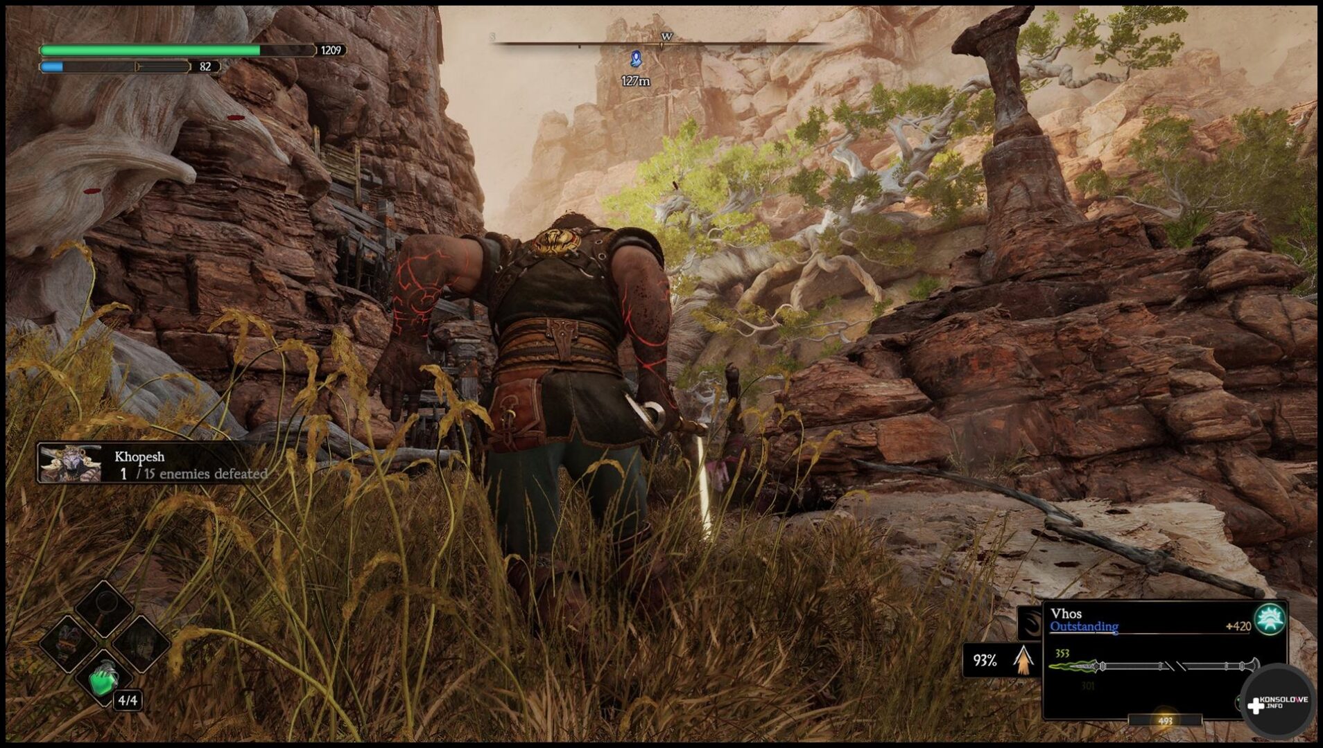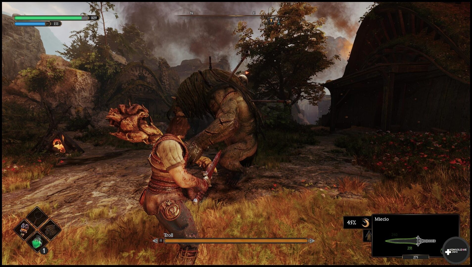 Należy jednocześnie uważać na poziom kondycji – jeśli spadnie do zera, nasze ataki będą niesamowicie ociężałe. Na szczęście można przytrzymać lewy spust, aby pasek dość szybko napełniał się. Trzeba także mieć świadomość, że oponenci potrafią stanowić niemałe wyzwanie, jeśli gracie na najwyższym poziomie, Steel. Starcia bywają wtedy wyzwaniem, które z pewnością doceni niejeden fan produkcji od FromSoftware. Nie znaczy to absolutnie, że Blades of Fire stanowi trudność na poziomie serii Dark Souls czy Elden Ring. Niemniej należy świadomie korzystać z dostępnych mikstur leczniczych oraz przełączać się między broniami na naszym podorędziu, jednocześnie zważając na wytrzymałość/kondycję naszego bohatera. Z poziomem Steel wiąże się też niestety pewna niesamowicie istotna wada. Mianowicie, na Steel nie możemy w opcjach wybrać pokazywania kolejnego celu na kompasie. Mając na uwadze fakt, iż mapy są bardzo obszerne, potrafi to doprowadzić do ogromnej frustracji i błądzenia po lokacji. Zdecydowanie uważam, że opcja ta powinna być dostępna niezależnie od wybranego poziomu trudności gry. Na szczęście można go zmienić niemalże w dowolnym momencie.