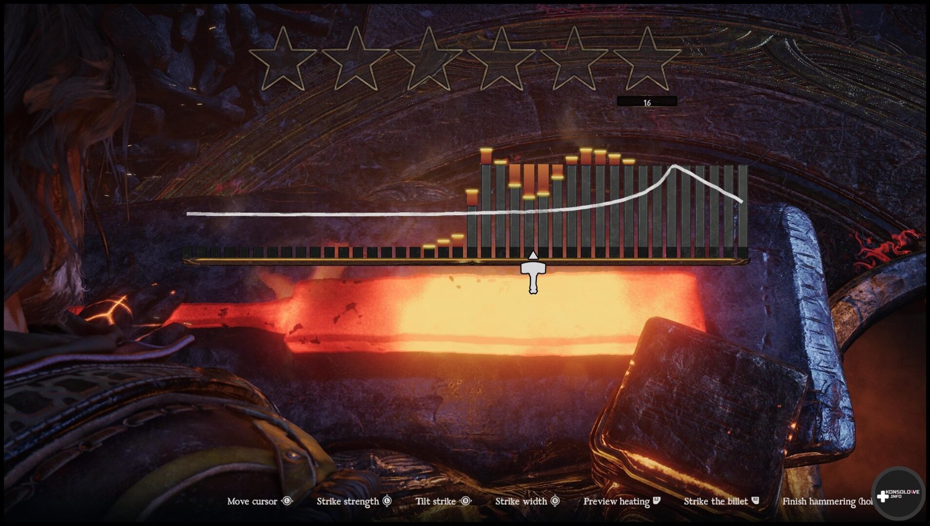 Niezwykle istotne jest skupienie się na samym procesie wykuwania broni. Po przystąpieniu do niego zobaczymy na ekranie docelową linię kucia. Naszym zadaniem jest jak najlepsze dopasowywanie poszczególnych wysokości słupków tak, aby jak najmniej odbiegały od tej linii. Nie obędziemy się przy tym bez zmieniania siły uderzeń, czy nawet kąta nachylenia młota oraz szerokości uderzeń. Dostosowujemy to za pomocą obu gałek analogowych kontrolera, a następnie uderzamy młotem, naciskając spust. Osiągnięcie jak najlepszej jakości oręża (symbolizowanej przez liczbę gwiazdek, jakie zapełniamy podczas kucia) nierzadko jest pewnym wyzwaniem. Broń oczywiście zużywa się, więc nieraz będziecie ją naprawiali – każda naprawa oprócz odpowiednich surowców pozbawia broń gwiazdki. Zdecydowanie należy więc dążyć do jak największej liczby gwiazdek wytwarzanej przez nas broni. Maksymalnie możemy tworzyć siedmiogwiazdkowy oręż, aczkolwiek najpierw należy odblokować większą maksymalną liczbę gwiazdek. Więcej o tym dowiecie się z następnego akapitu.