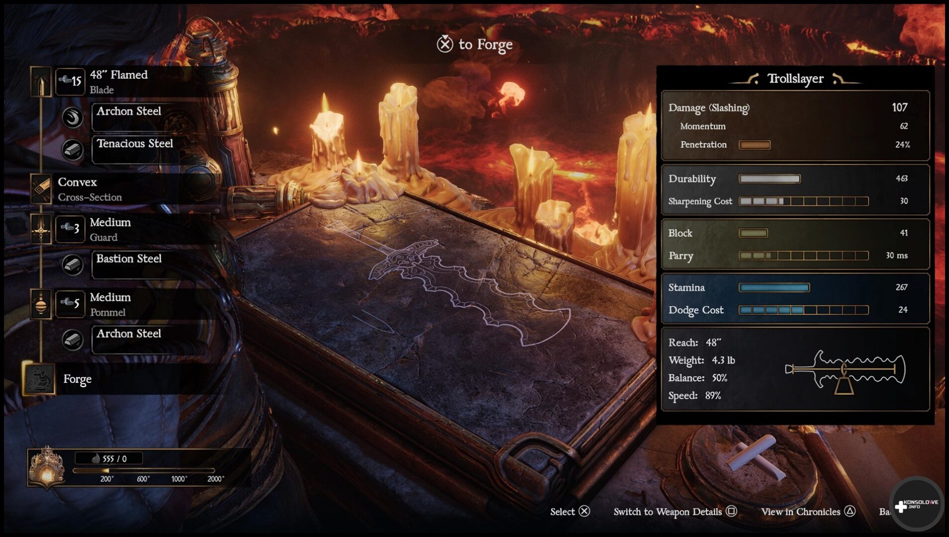 Następnie wybieramy warianty wyposażenia – długość elementów, czy – przede wszystkim – surowiec, z którego dany element zostanie wykonany. Im lepszej jakości surowiec, tym oczywiście bardziej zabójcza lub wytrzymała może być broń. Po zaakceptowaniu wszystkich parametrów przystępujemy do kucia. Warto też wspomnieć, że najpierw zobaczymy jak Aran umieszcza metale w palenisku i rozpala piec – miły smaczek, który w razie takich preferencji możemy pominąć, przytrzymując przycisk O na padzie. Lepsze surowce – które sami wybierzemy – można pozyskać, oddając wsławione bronie Glindzie. Warto jeszcze zaznaczyć, że możemy mieć maksymalnie 24 sztuki oręża – 4 w szybkim wyborze oraz 20 w ekwipunku. Jest to jednak na tyle spory limit, że nie powinien Wam przeszkadzać w rozgrywce.
