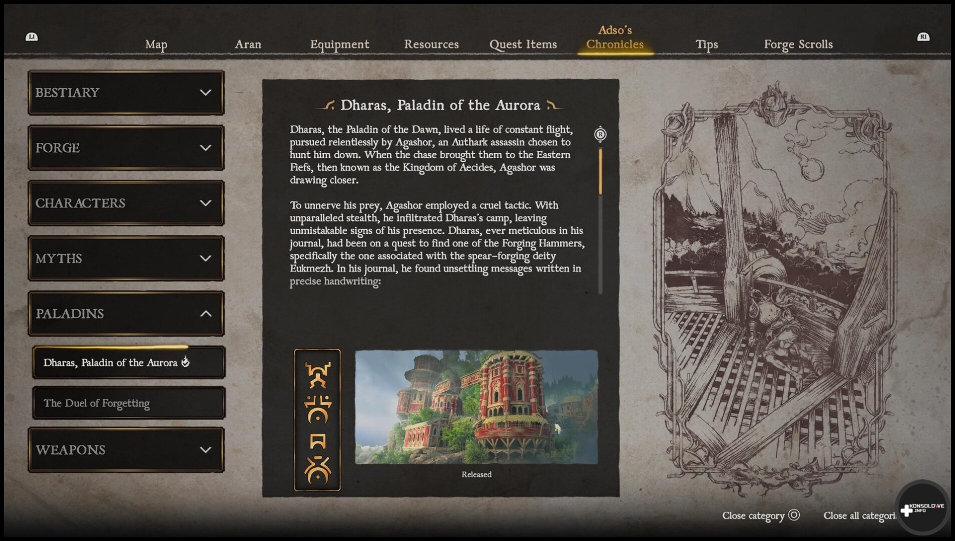Nie należy również zapomnieć o świetnym bestiariuszu. Początkowo proste szkice przeradzają się w miarę liczby pokonywanych wrogów w porządne, szczegółowe ilustracje. Ba, nawet możemy udać się do naszego domu i przyjrzeć się szkicom miejsc, które odwiedziliśmy. Doceniam także fakt, iż gra działa w rozdzielczości 4K w 60 klatkach na sekundę. Nie ma tu wyboru trybu działania, ale w związku z takim działaniem nie mam żadnych zastrzeżeń. No, może poza brakiem polskiej wersji językowej.