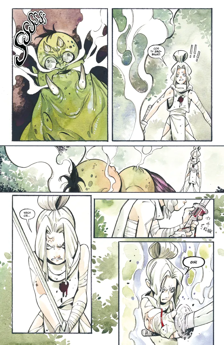 Droga naszej bohaterki prowadzi przez pogrążone we mgle lasy, w których czają się groźne stwory z najmroczniejszych baśni. W trakcie wędrówki Mariko odkryje w sobie duchową moc, podobną do tych, których doświadczył bohater gier z serii NiOH od studia Team Ninja. Po drodze spotkamy zmiennokształtną kobietę o błękitnej skórze (Hej Mistic!), zielonego olbrzym o nadludzkiej sile (wiadomo kto), boginię wiatru i boga gromu szukający sposobności do spłaty honorowego długu. Jest tu także srebrna wojowniczka, która najbardziej na świecie pragnie… krwi Mariko. Spotkanie tych dwóch młodych kobiet, to nieprawdopodobna i cały czas trzymająca w napięciu historia z mocnym finałem. Naprawdę, możecie mi wierzyć lub nie, ale Dni demonów przeczytałem jednym tchem, nie odchodząc nawet na chwile od biurka.