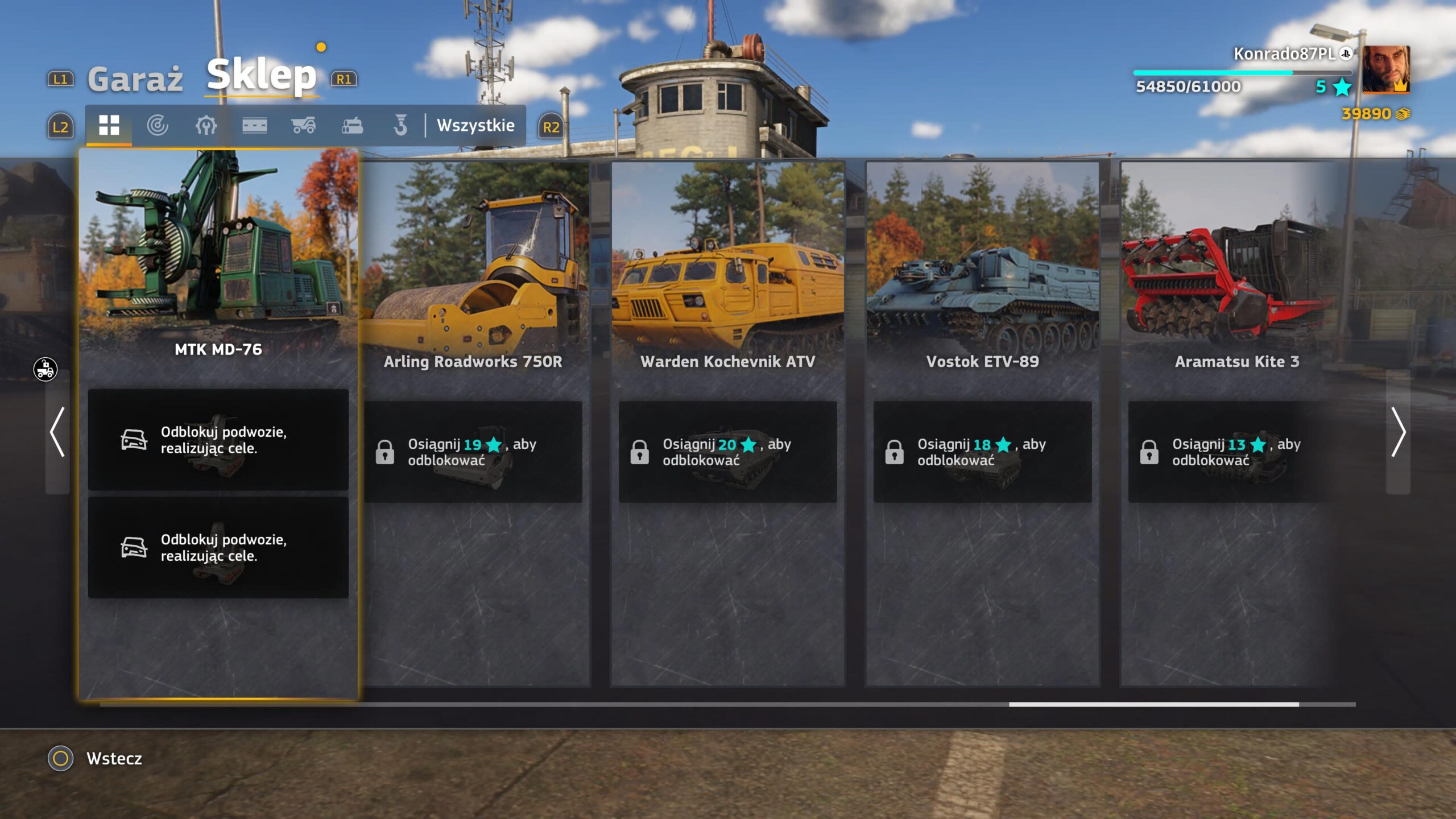 Na koniec zostawiłem to, co z pewnością najbardziej interesuje dużych chłopców, czyli dostępne maszyny i pojazdy w grze. Tych jest ponad 40, więc jest to jak najbardziej zadowalająca liczba. Warto dodać, że RoadCraft od dnia premiery obsługuje mody, więc liczba pojazdów będzie szybko wzrastać. Pojazdy i maszyny budowalne podzielono na sześć kategorii: zwiadowcze, specjalne (wywrotki, transportery, kablowiec), roboty drogowe (walce, spycharki), ładunki (ciężkie pojazdy transportowe), wycinka drzew oraz dźwigi mobilne. W pierwszych godzinach rozgrywki do dyspozycji mamy tylko stare i zardzewiałe pojazdy, które przetrwały skutki katastrofy. Nowocześniejsze pojazdy kupimy oczywiście w sklepie za odpowiednią ilość gotówki. Jednak, aby były dla nas dostępne musimy najpierw zdobyć odpowiednią liczbę punktów doświadczenia.