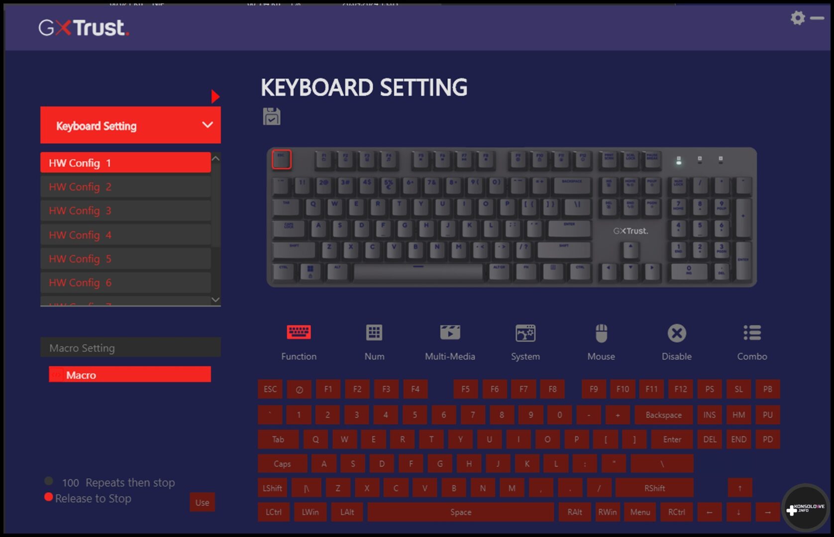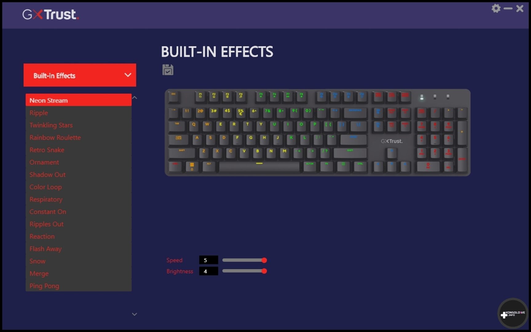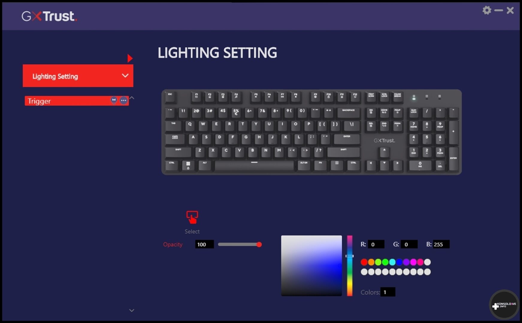 Trust nie zapomniał też o dodaniu do swojego produktu specjalnej aplikacji. Nosi ona nazwę Trust GXT 871 ZORA i umożliwia personalizowanie działania sprzętów właśnie z tej rodziny. Wystarczy włączyć aplikację, wybrać podłączony sprzęt, który chcemy dostosować i przenieść się tym samym do jego konfigurowania. W przypadku GXT 871 znajdziemy tu przede wszystkim opcje zmiany koloru podświetlenia klawiszy. Możemy wybrać konkretny kolor dla całej klawiatury lub jej części z wygaszoną resztą. Nie brakuje także kilku animacji przechodzenia barw, aczkolwiek nie podoba mi się brak możliwości wybrania na stałe podświetlenia konkretnych sekcji klawiatury na osobne kolory. Plusem jest natomiast obecność makr.