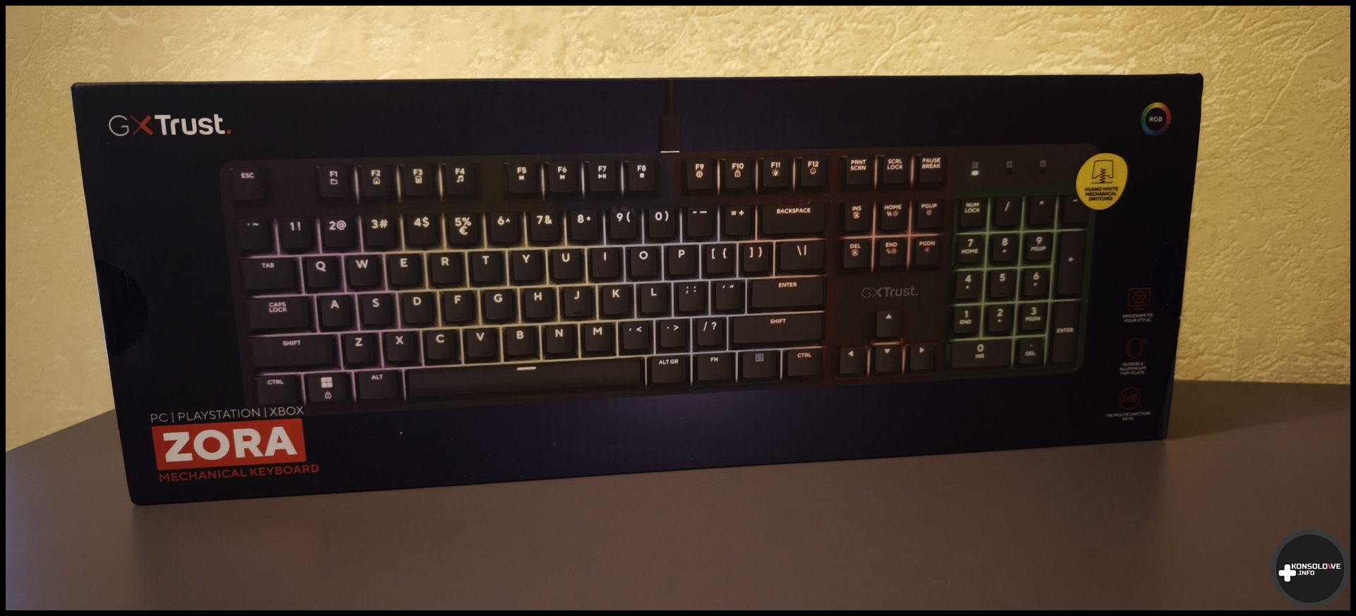 Opakowanie, w którym dostarczana jest klawiatura z zewnątrz wygląda dość elegancko. Na górze widać zestawienie najważniejszych funkcji, jak zgodność z konsolami i komputerami, czy podświetlenie. Po uniesieniu wieka zauważymy dość prosty karton, w którym umieszczono bardzo krótką instrukcję, klawiaturę oraz kabel USB C do USB A. Wyciągając klawiaturę Trust ZORA GXT 871, momentalnie odnotujecie jej niemałą wagę. Ma ona bowiem niemal kilogram. Samo podłączenie jej do konsoli czy komputera jest naprawdę banalnie proste. Odbywa się to bowiem o prostu wyłącznie za pomocą dołączonego kabla – końcówka USB C idzie do tyłu klawiatury, a wtyk USB A do docelowego urządzenia. Nie omieszkałem sprawdzić jej zarówno w grach, jak i pracy biurowej. Oto moje spostrzeżenia.