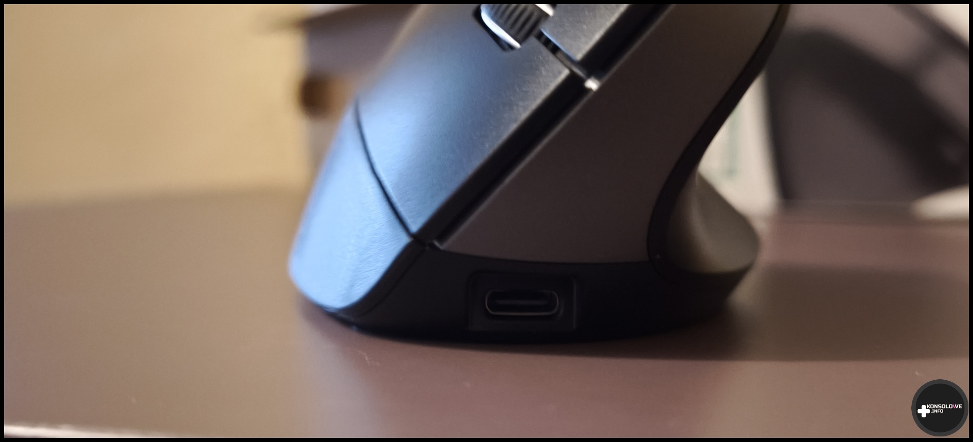 W dolnej części myszki Trust Bayo+ również znajdzie się sporo ważnych elementów. Przede wszystkim znajdziemy tam port USB typu C, dzięki któremu – za pomocą dołączonego kabla USB C do USB A – naładujemy myszkę. Pełne uzupełnienie jej akumulatora zajmuje około 3 godzin. Warto jednocześnie zaznaczyć, że w razie potrzeby można korzystać z tego akcesorium podczas ładowania go. O ładowaniu informuje nas dioda na pomiędzy lewym przyciskiem myszy, a dodatkowymi dwoma na boku. Należy docenić, że nie rozprasza nas ona podczas pisania – spoczywa bowiem na niej nasza dłoń. Zajrzyjmy teraz na sam spód. Odwróćmy myszkę i zobaczmy, co tu znajdziemy. Pierwszym, co rzuca się w oczy bez wątpienia jest płytka. Kryje się pod nią odbiornik na USB A.