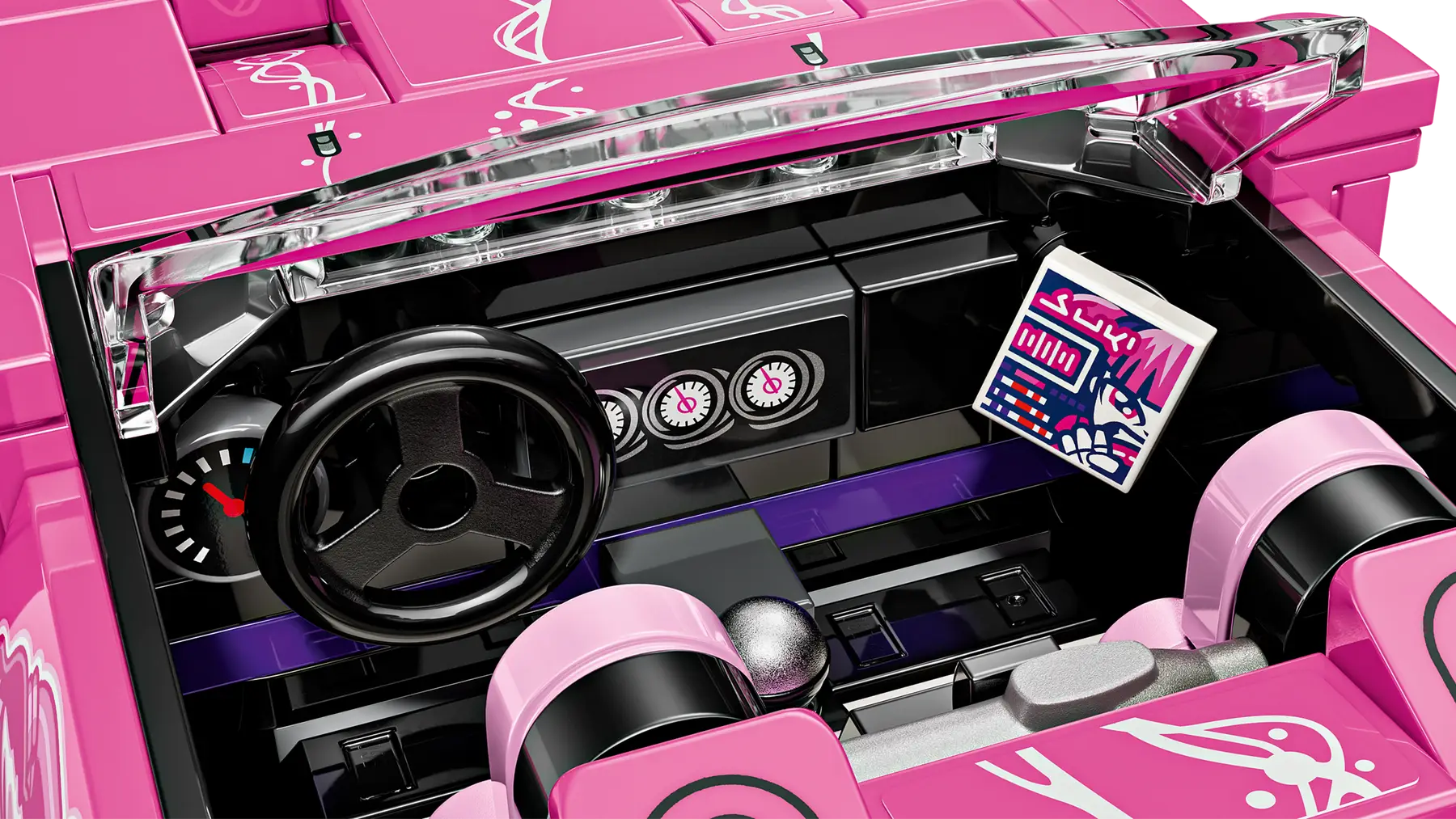Ten samochód z serii LEGO Szybcy i wściekli jest pełen realistycznych funkcji — ma monitor w środku, tylne skrzydło, grill, światła, koła i charakterystyczną grafikę w stylu anime na masce, bokach i tyle samochodu. Zestaw LEGO zawiera również minifigurkę postaci Suki, którą dzieci mogą umieścić za kierownicą, aby odgrywać niesamowite wyścigi uliczne.