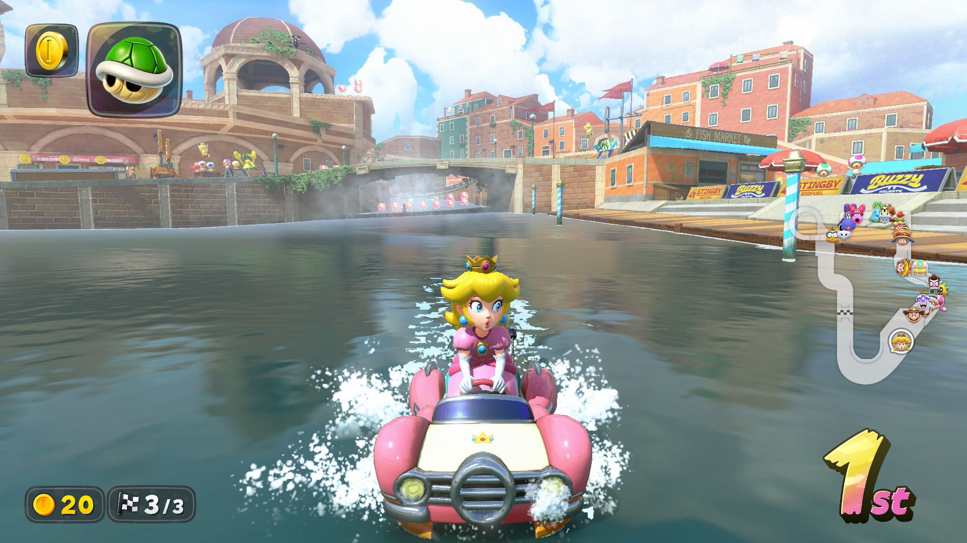Pierwszą rzeczą, która bez wątpienia rzuca się w oczy po uruchomieniu „Mario Kart World”, jest świetna grafika. Gra działa w rozdzielczości 1080p w trybie przenośnym i 1440p w trybie zadokowanym. Oba tryby zablokowano w stałych 60 klatkach na sekundę. Dzięki zastosowaniu nowych technologii, światła i cienie prezentują się bez zastrzeżeń. Każda trasa – od klasycznych plansz po nowe lokalizacje inspirowane realnymi miastami są dopieszczone w najmniejszych detalach. Tekstury, animacje, interaktywne otoczenie – wszystko tętni życiem, jak w filmie animowanym Pixara.