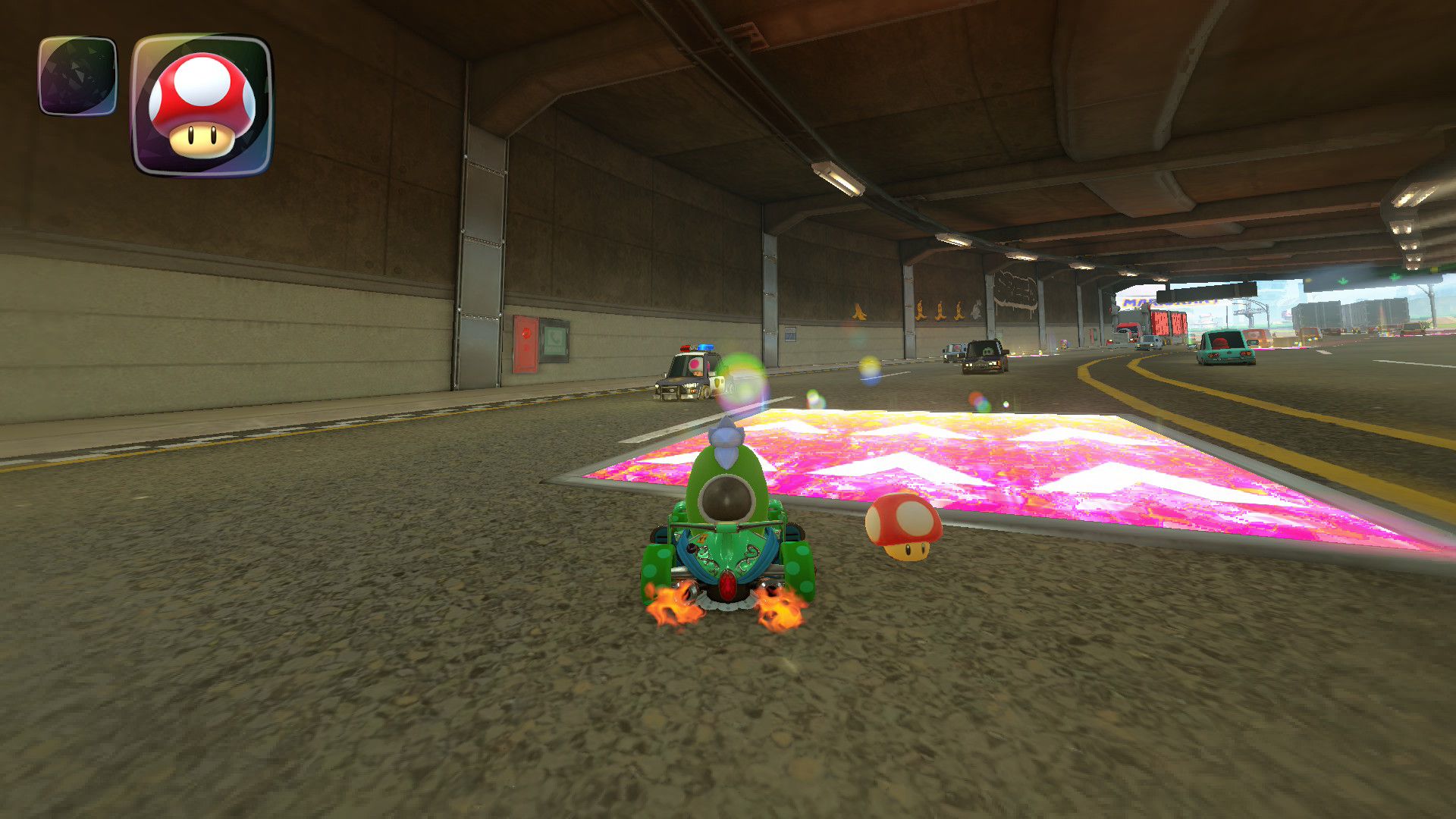 Świetnie zaprojektowano trasy w nowym trybie Knockout Tour. Odwiedzamy tam obszary przypominające regiony z naszego świata, choćby długi most z San Francisco. Te lokacje nie są jedynie wizualną ciekawostką – ich projekt wpływa na mechanikę jazdy i wymaga od nas odpowiedniego podejścia do pokonywania zakrętów oraz przeszkód. Trasy potrafią zmieniać się dynamicznie w trakcie wyścigu. A wraz z nimi nasz gokart często przemienia się w samolot lub motorówkę. Do tego w grze występuje dynamiczny system pogodowy, mamy wyścigi w dzień, jak i w nocy. No i na koniec koniecznie muszę dodać, że nieprzewidywalny ruch uliczny czyni każdą rundę bez wątpienia bardziej emocjonującą.