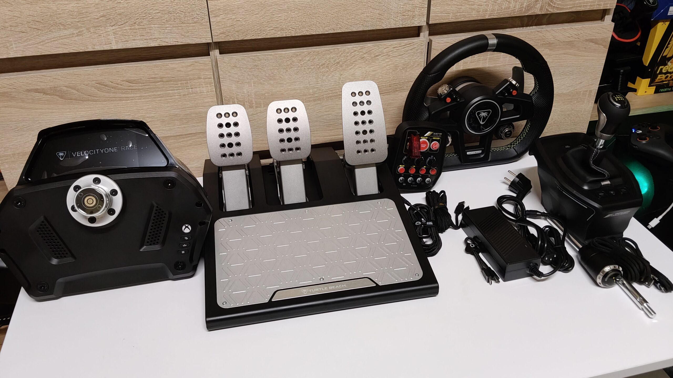 Tuż po otwarciu pudełka w nasze ręce wpada duża obrazkowa instrukcja podłączenia wszystkich elementów zestawu Turtle Beach. Następnie musimy rozpakować duże płaskie kartonowe pudełko. Znajdziemy w nim sportową obręcz w kształcie litery D, wspomniany już panel z pokrętłami i przełącznikami oraz zasilacz wraz z odpowiednimi kablami do różnych gniazdek elektrycznych. Pod tym pudełkiem z zestawem akcesoriów umieszczono oczywiście bazę VelocityOne Race wraz z zestawem pedałów wyścigowych.