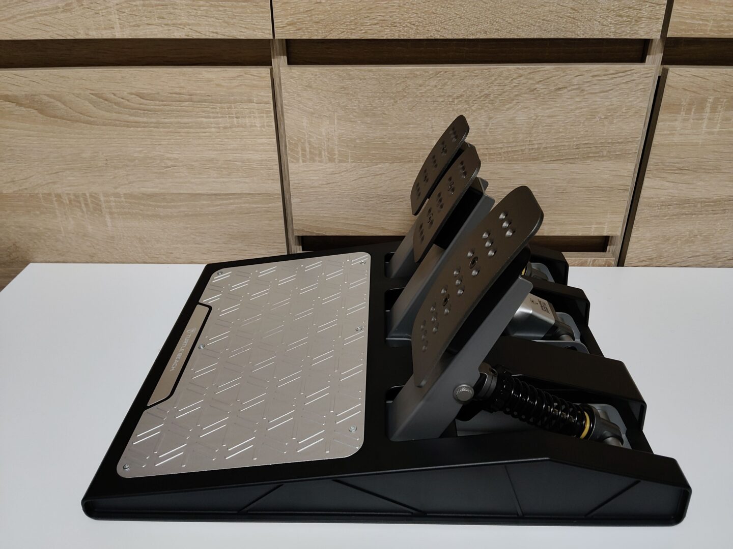 Zestaw manipulatorów nożnych składa się z trzech pedałów: gazu, hamulca i sprzęgła. Obudowę wykonano z plastiku, natomiast same manipulatory są aluminiowe. Co ciekawe pedał hamulca wyposażono system Load-Cell dla większego realizmu. Load-Cell w odróżnieniu od standardowego pedału hamulca mierzy nie wychylenie, a siłę nacisku na manipulator nożny. Działa to podobnie jak w prawdziwym samochodzie, gdy mocniej naciśniemy pedał hamulca, to poczujemy ostrzejsze, nagłe zatrzymanie. Niestety minusem tego systemu jest to, ze zestaw pedałów musi być zamontowany na stelażu, gdyż musimy użyć dużej siły (nawet 50 kg!), aby czujniki odczytały nasze zamiary hamowania. Z dywanu czy paneli podłogowych zestaw pedałów lub krzesło po prostu wam odjedzie. Regulację tego dynamicznego systemu hamowania możemy łatwo przeprowadzić na wyświetlaczu kierownicy lub za pomocą aplikacji Tuner Companion na PC, Xbox, a nawet smartfonach.