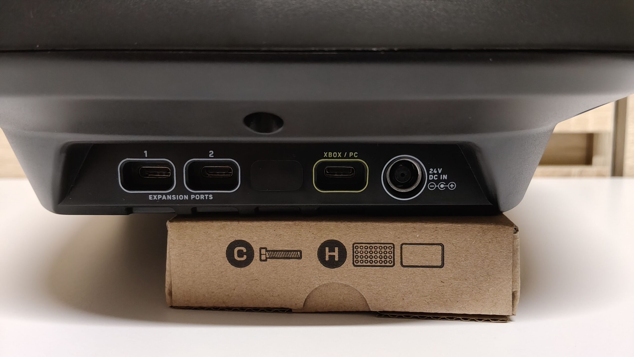 Będąc przy bazie VelocityOne Race chciałbym producenta pochwalić za świetne wykonanie kabli oraz ich odpowiednie oznaczenie. Wszystkie kable są w oplocie, do tego zakończono je wtyczkami USB-C, w przypadku awarii szybko taki kabel więc wymienimy. Do tego końcówki są oznaczone odpowiednimi kolorami. Żółty służy do podłączenia bazy do PC lub Xboxa. Natomiast białe kable odpowiadają za podłączenie dodatków takich jak manipulatory nożne oraz skrzynia biegów. Wszystkie kable podłączamy z tyłu bazy. Wyjątkiem jest krótki kabel od buttonbox-a, który swoje porty USB-C ma po obu stronach bazy.