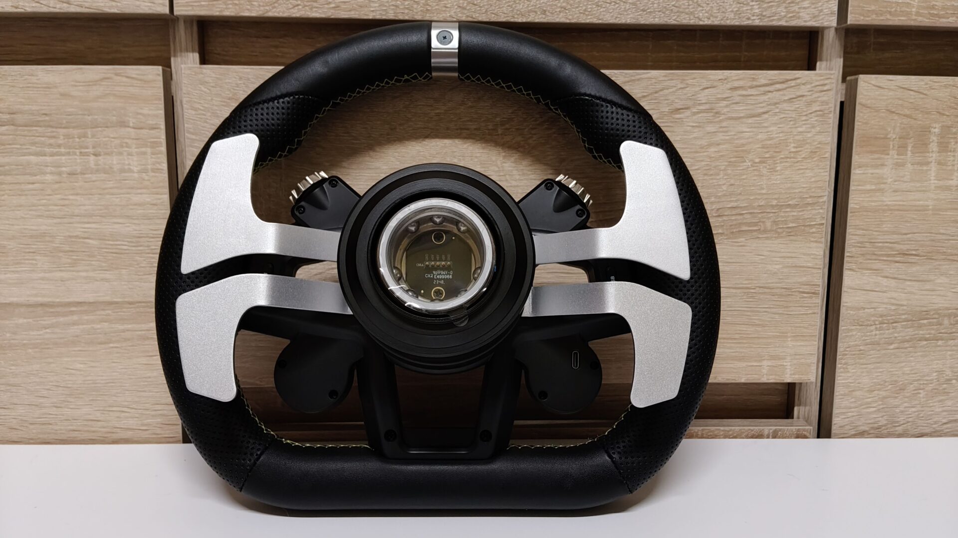 Obręcz kierownicy ma 30 cm średnicy, więc jest to jak najbardziej zadowalający wymiar. Wizualnie wykonanie oraz sam sportowy kształt nawet mnie się podoba. Trudno nie odnieść wrażenia, że przy projektowaniu, producent nie wzorował się na kierownicy z Audi R8. Obręcz kierownicy ręcznie obszyto skórą ekologiczną, szycie prezentuje się naprawdę ładnie. Niestety sam uchwyt wydaje się zbyt twardy, dlatego też warto pomyśleć o rękawiczkach wyścigowych do dłuższej jazdy. Co ciekawe, kierownicę wyposażono w podwójne, co ważne magnetyczne manetki. Górne służą oczywiście do zmiany biegów, a dolne przeznaczono do używania sprzęgła i hamulca ręcznego. Fani driftu, gier rajdowych, czy Formuły 1 z pewnością docenią taki dodatek.