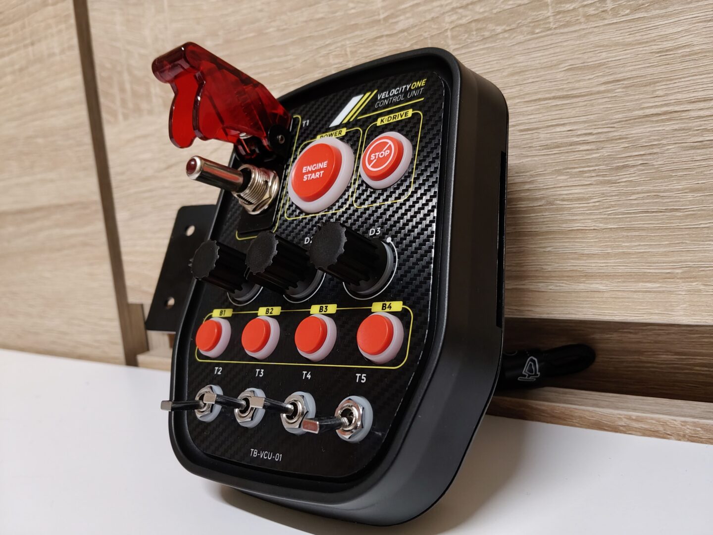 Buttonbox ma kilka przycisków, pokręteł oraz przełączników, niestety nie jest to jakość premium, ani z wyglądu, ani z funkcjonalności. Na plus na pewno mogą zaliczyć podświetlanie wszystkich przycisków oraz podświetlanie przełącznika zapłonu, który po uniesieniu do góry na końcówce świecie czerwonym światłem. Nie da się ukryć, że najbardziej zadowoleni z tego panelu bocznego będą fani ETS2 i American Truck Simulator. Ogólnie jestem bardzo rozczarowany tym panelem z przyciskami, jest mały, kiepsko wykonany, trzyma się na cienkiej blaszce, a do tego duży przycisk Start Engine nie uruchamia silników pojazdów w grach. Lepiej zainwestować w dużego, osobnego buttonbox-a.