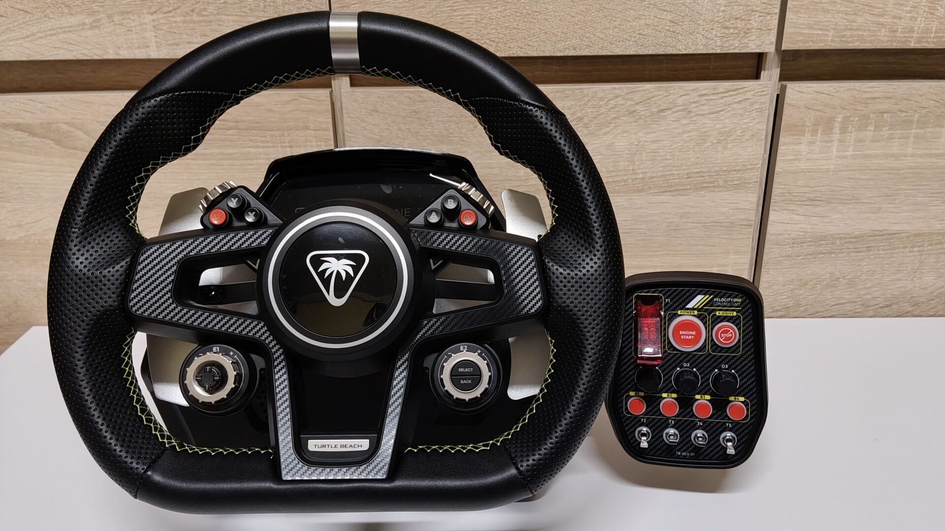 Przede wszystkim należy pochwalić firmę Turtle Beach za dołączenie do zestawu buttonbox-a. Niestety jest on wielkości mojej dłoni oraz w całości wykonano go z plastiku. Na plus na pewno warto zaliczyć fakt, ze buttonbox-a możemy zamontować zarówno z prawej, jak i lewej strony kierownicy. Niestety panel montujemy do bazy na cienkiej blaszce, przez co każde klikanie przycisku powoduje bujanie panelem, a to szybko staje się bardzo irytujące. Miłym akcentem jest to, że możemy kierownicę uruchomić, naciskają przycisk „Start Engine” na buttonboxie. Niestety to jedyna funkcja tego przycisku, nie ma on żadnej opcji wejściowej, więc nie uruchomimy nim silnika pojazdu w grze. Drogie Turtles Beach, to duże faux-pas z waszej strony. Kierownice uruchomimy również naciskając przycisk po prawej stronie bazy VelocityOne Race.
