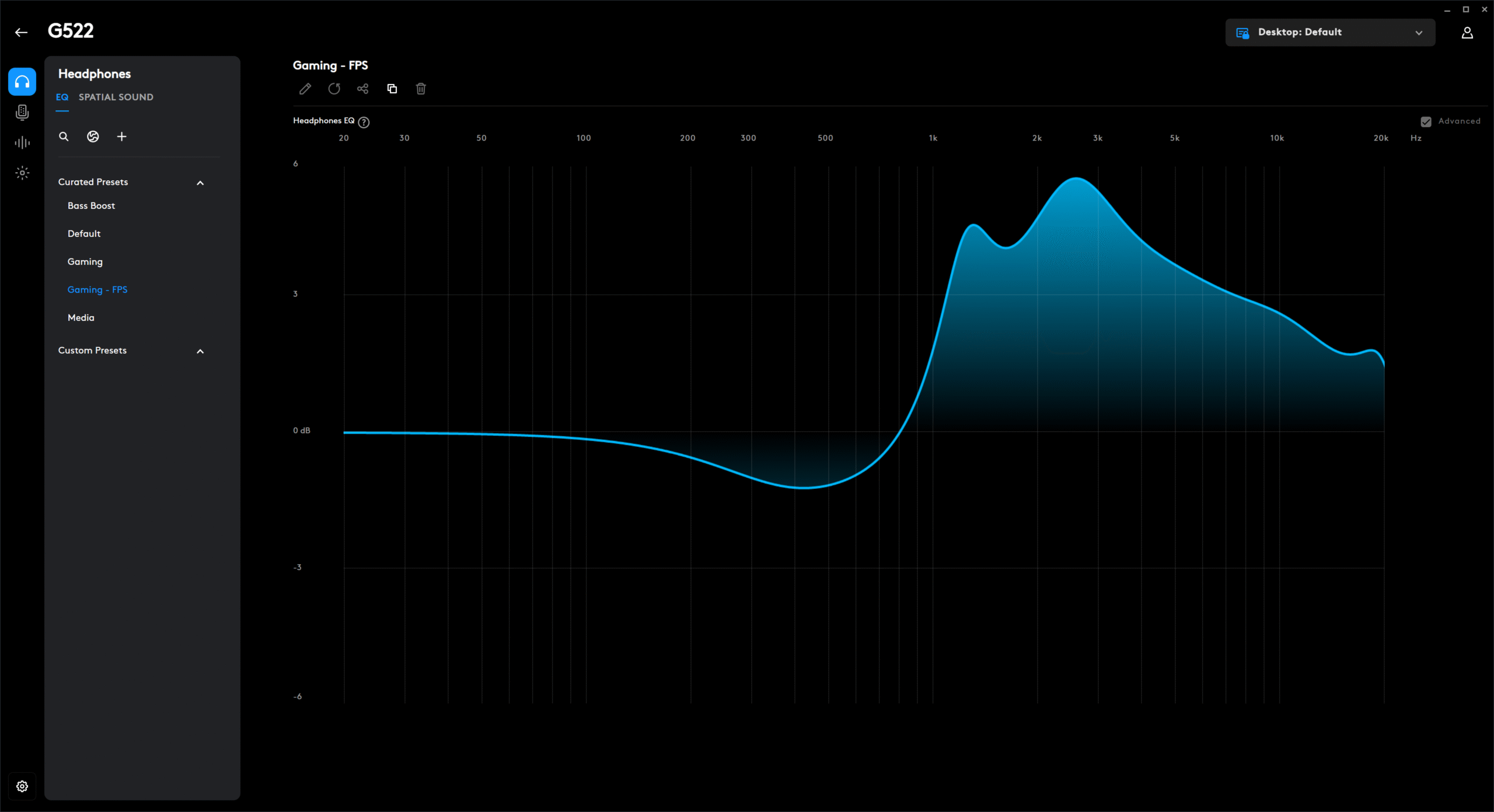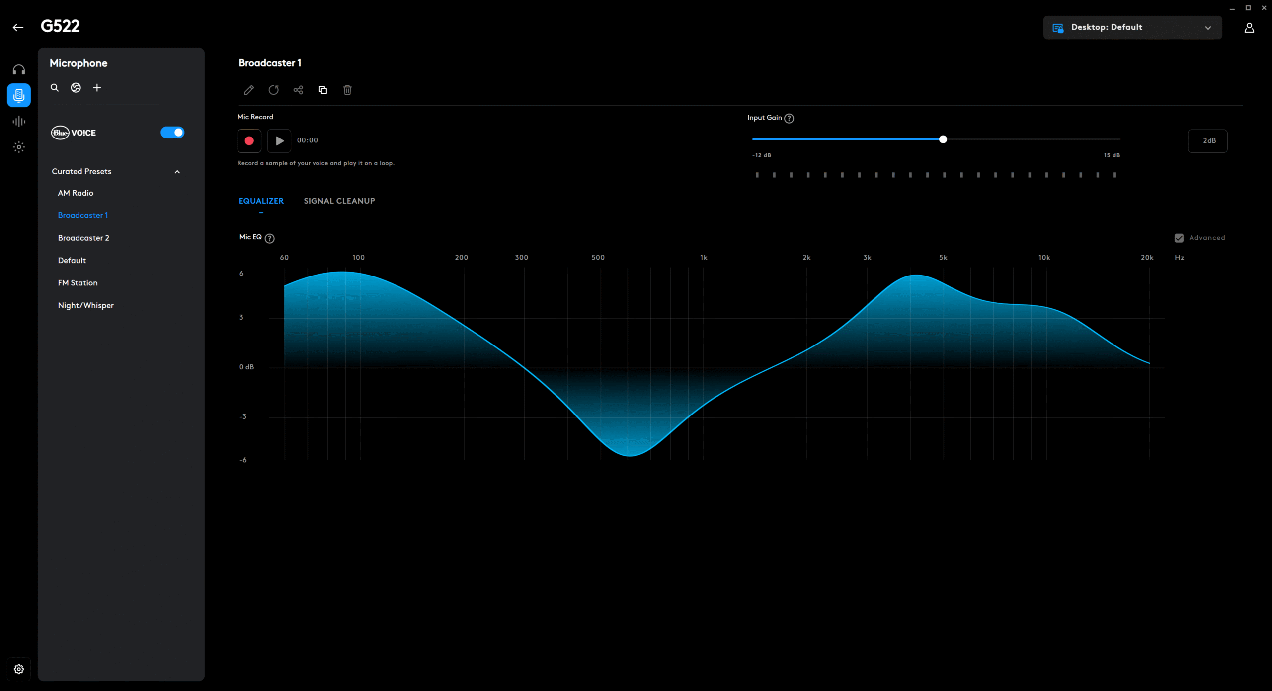 Mikrofon – jak większość słuchawek Logitech, tak i model G522 wspiera Blue Vo!ce, czyli oprogramowanie mikrofonu przygotowane przez Blue. W aplikacji znajdziemy domyślne ustawienia, które skupią się bardziej na cichych brzmieniach szeptu, czy sprawią, że nasz głos będzie brzmiał jak w radiu czy podcaście.