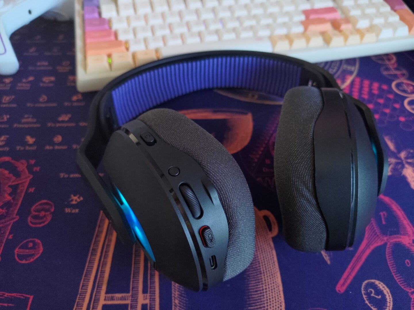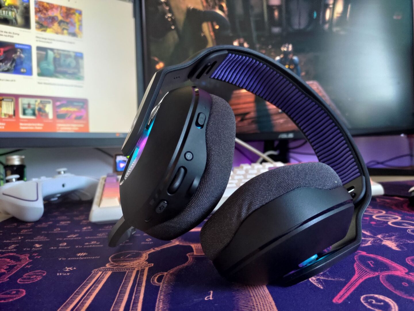 Na lewym nauszniku znajduje się także całe „centrum zarządzania”. Mamy tam wejście na kabel USB-C, przycisk wyciszania, kółko do regulacji głośności, przycisk do parowania BT oraz przełącznik do włączenia słuchawek. Powyżej niego jest także światełko, które pokaże nam czy słuchawki są w trybie Bluetooth czy Lightspeed. Światełko będzie też intensywnie mrugać na niebiesko, jeśli będziemy je parować.